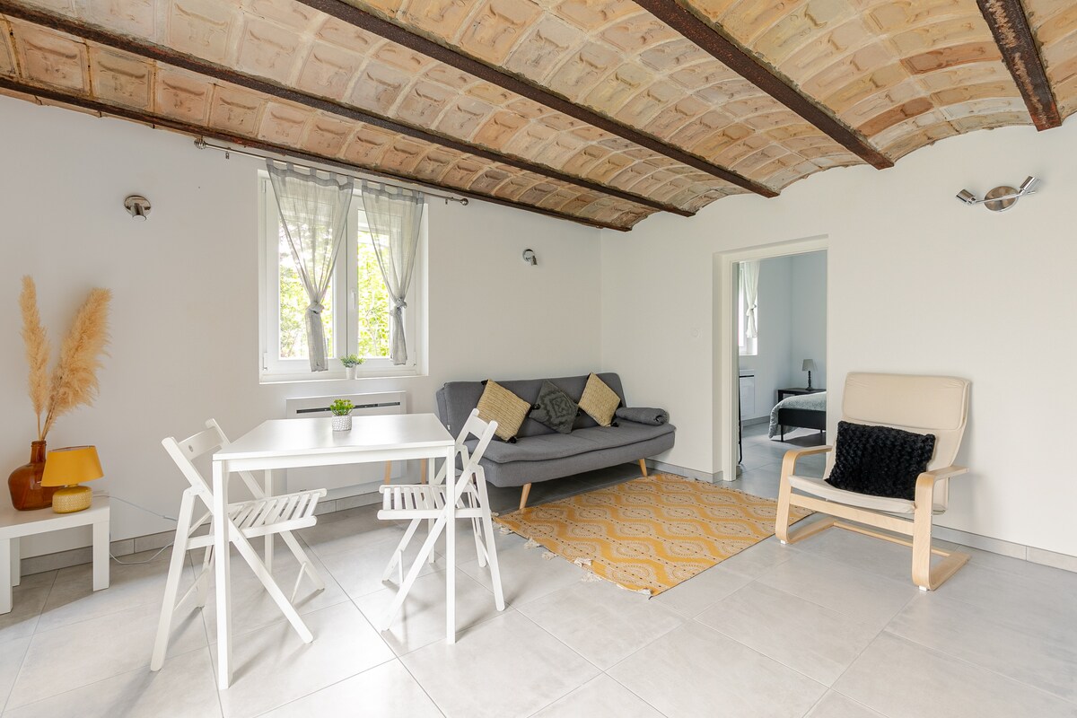 Apartamento de 2 habitaciones de 30 m2 en la planta baja del jardín: - dormitorio con 1 cama de 140 x 200 cm - sala de estar equipada con un sofá cama convertible - cuarto de baño con ducha, inodoro - cocina equipada con lavavajillas, horno, microondas, hervidor, cafetera … En el corazón de una casa de varios apartamentos tranquilos en un entorno verde. Sábanas (camas a hacer por el viajero) y toallas disponibles incluidas en la tarifa de limpieza.