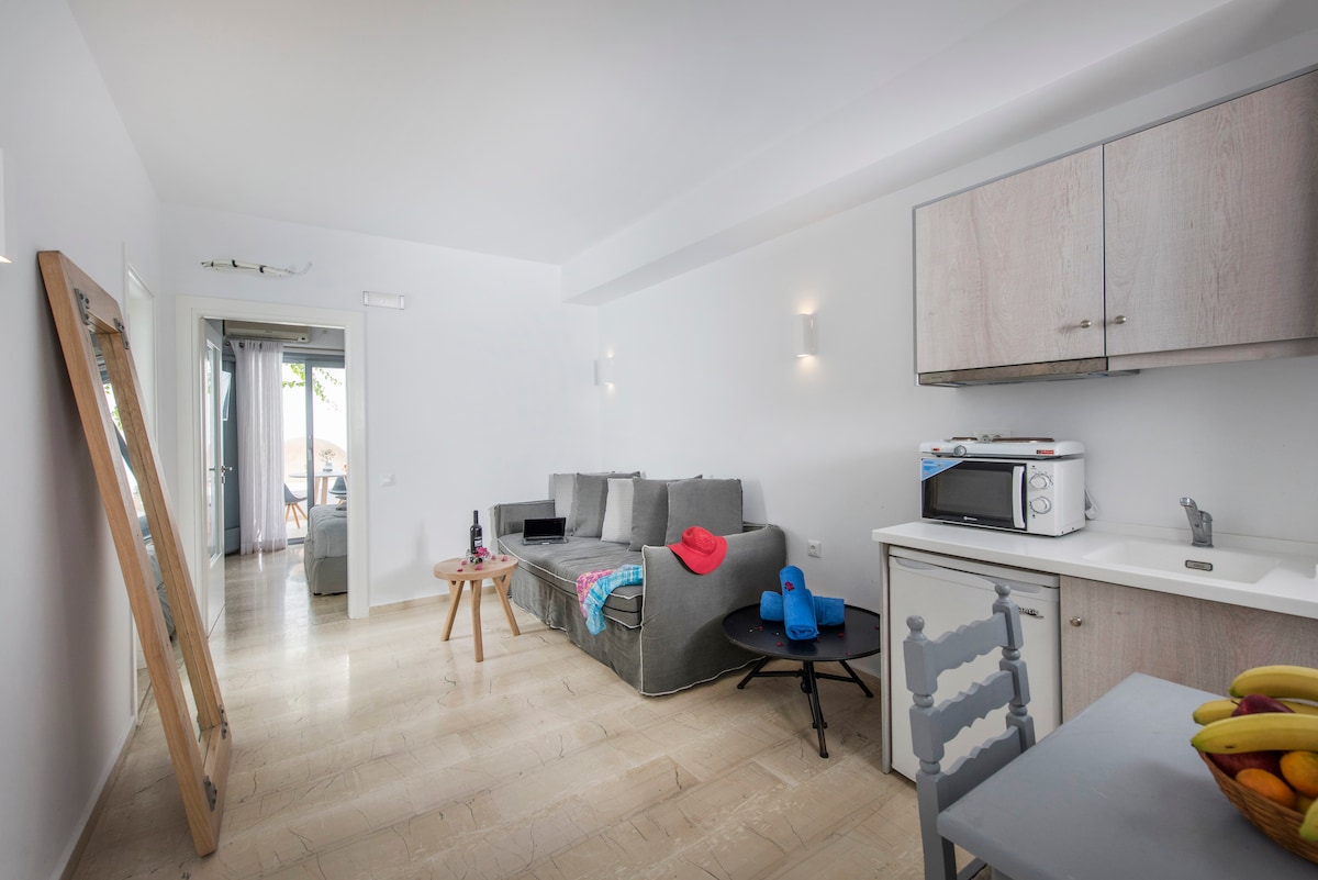 Diseñada dentro de una casa cueva tradicional, esta elegante suite ofrece una armoniosa mezcla de carácter cicládico y comodidad moderna. Entra en un refugio sereno con un dormitorio acogedor con una cama tamaño queen, una acogedora sala de estar con una cocina totalmente equipada y un sofá que acomoda cómodamente a un tercer huésped. Lo más destacado de la suite es su lujoso baño, donde encontrarás una amplia bañera de hidromasaje interior, perfecta para relajarte después de un día explorando la isla.