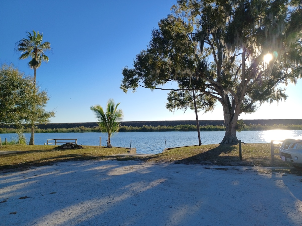 Cabaña glamping - Tan relajado y cómodo. ¡Desconecta y relájate! Relájate en tu propio lugar con un porche cubierto con vistas al canal y a las palmeras. Estancia de trabajo, viaje de pesca con acceso al lago Okeechobee o retiro de artistas. Nota: En este momento, al igual que en el campamento, caminarás hasta tu baño privado en nuestro alojamiento principal (entrada independiente). El vestíbulo es compartido, el baño es privado. Hay wifi pero no TV (próximamente). Disfruta del glamping pero con comodidades interiores, aire acondicionado, calefacción, cómoda cama tamaño queen con colchón de espuma viscoelástica.