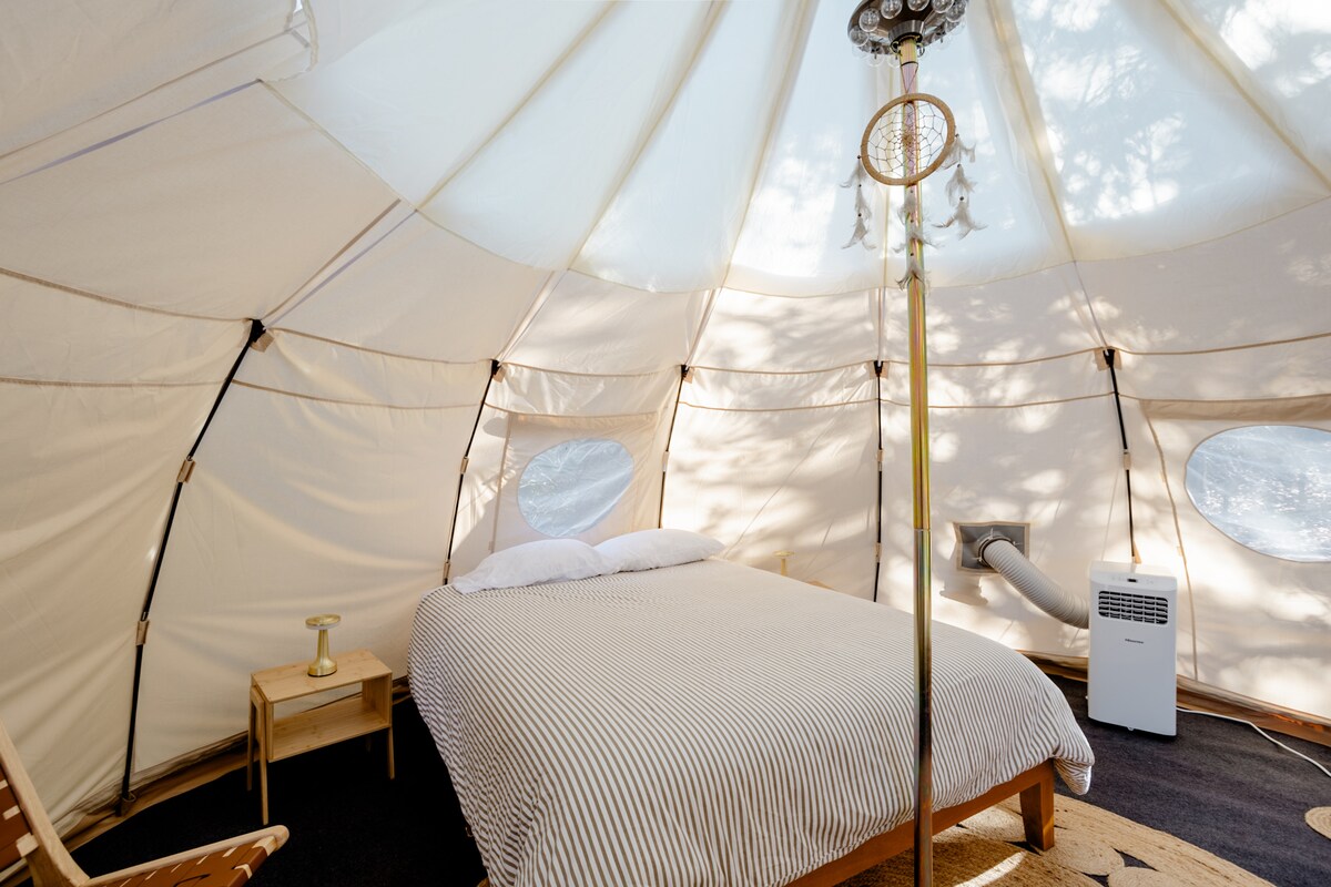 Disfruta del encantador entorno de este romántico lugar en la naturaleza. Este es nuestro primer glampsite completo en 20 acres. La propiedad tiene vistas increíbles, senderos serenos y la tienda de campaña está equipada con electricidad y un pequeño aire acondicionado que hace que dormir sea cómodo, aunque no funciona muy bien en el calor del día. Es una escapada perfecta para parejas locales o una estancia inolvidable para las personas que pasan. La tienda de campaña es nuestro primer lugar en los senderos, ubicado detrás de nuestra casa.