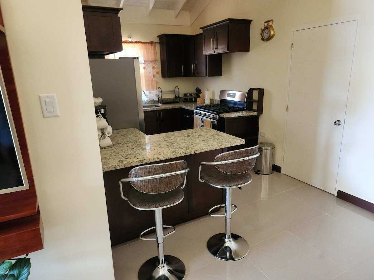 Modern Home Gated. Fully Solar 1 King size bed, 1Q-B, 2baths located in Old Harbour with GAZEBO and BAR. This amazing home also decked with LED Lighing, 1 fancy Kitchen an laundry. It's fully A/C and grilled with 24/7 security, Smart lock, Free NetFlix, also CCTV Cameras for your safety, a fire place. All furnitures are brand new to suit your needs. This is situated closed to the Town, Restaurant, Jerk Centre, KFC, Juici Beef, High 2000, 30mins portmore spanish Town 1 hour to Ocho Rios.