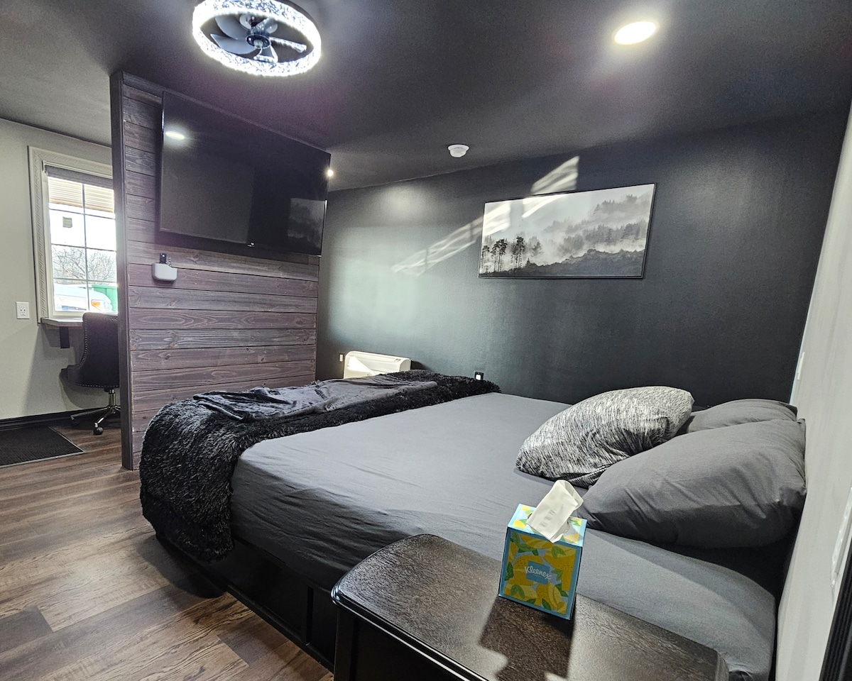 Room #1 "White Elegance" This room Is one of 4 room available at this time. FireSide Suites is still a work in progress. This one of a kind Motel remodel is underway. We bring you a fresh new look with comfort, convenience while keeping the little things in mind. Each room has a number as well as name. A bright and cozy feel. Relax in the corner tub while feeling right at home. Boat parking is available in front of the garage