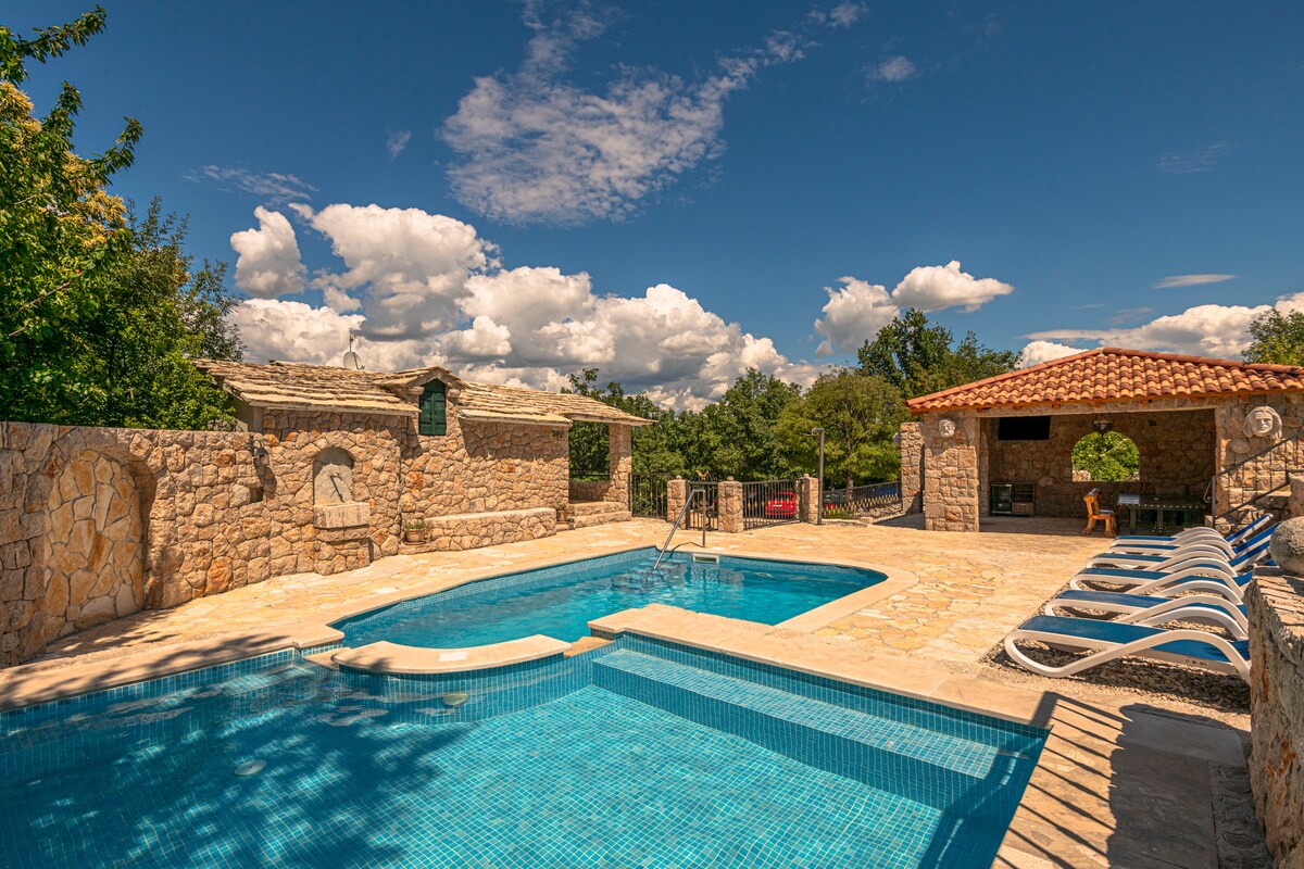 Julio y agosto: ¡solo reservaciones de sábado a sábado! Villa Marchelina, hermosa villa de piedra con piscina, ubicada en Grubine, en un pedazo intacto de Dalmacia, cerca de la ciudad de Imotski (interior). Está completamente hecha de piedra y tiene capacidad para 12 personas. Cuenta con todo lo necesario para unas vacaciones perfectas en paz y tranquilidad. Piscina con cómodas camas de piscina y sombrillas. Niños amigables con un gran parque infantil para ellos (cama elástica, columpios, toboganes, casa de niños, pelota, etc.).