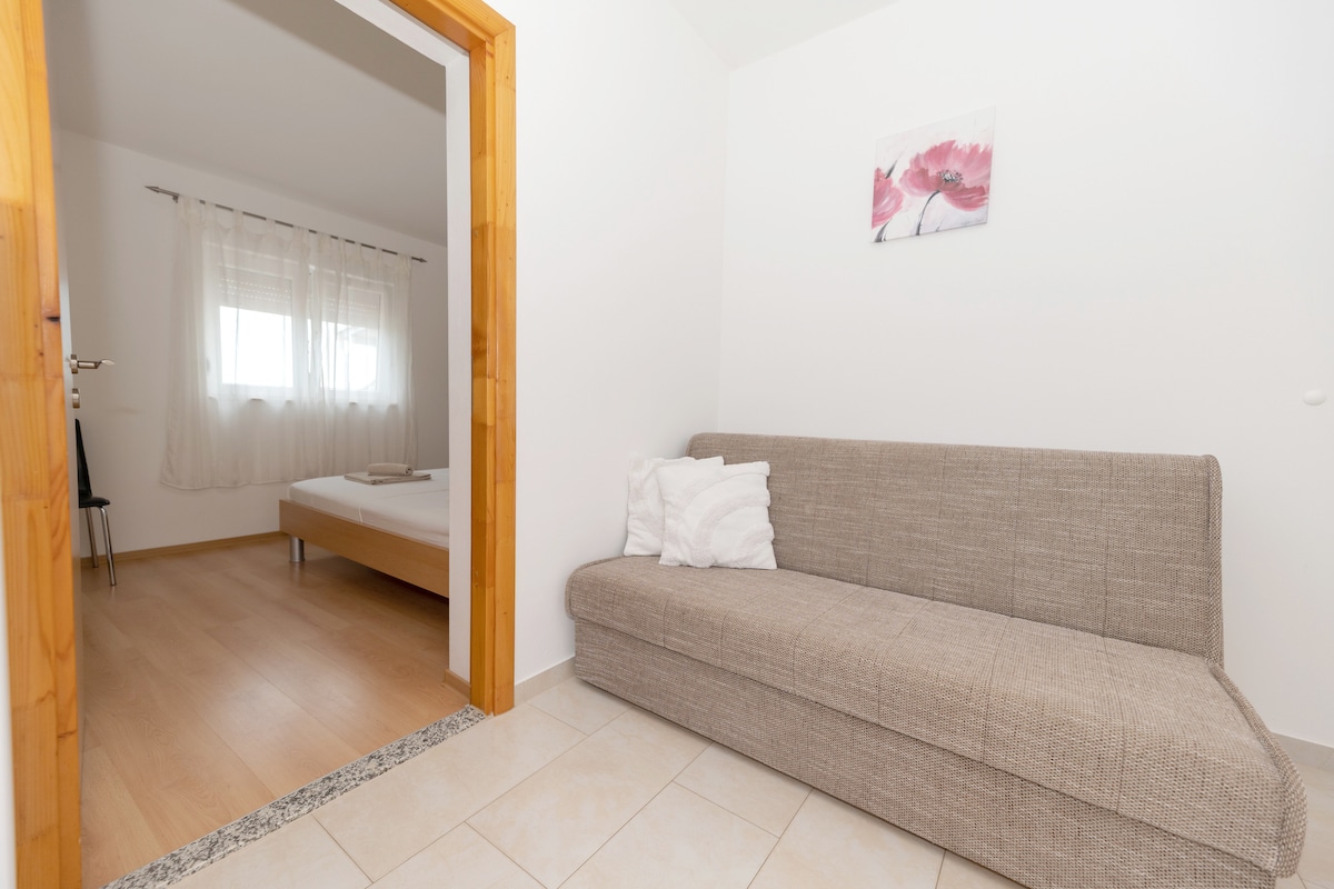 Ofrecemos un apartamento de nueva construcción con dos dormitorios, baño y cocina equipada. El apartamento está ubicado en un pequeño pueblo llamado Baraći. Además del apartamento, hay una chimenea justo al lado y un patio para que los niños jueguen y tú disfrutes de las noches de verano. También ofrecemos un servicio de transporte desde el aeropuerto, experiencia de buceo y mucho más.