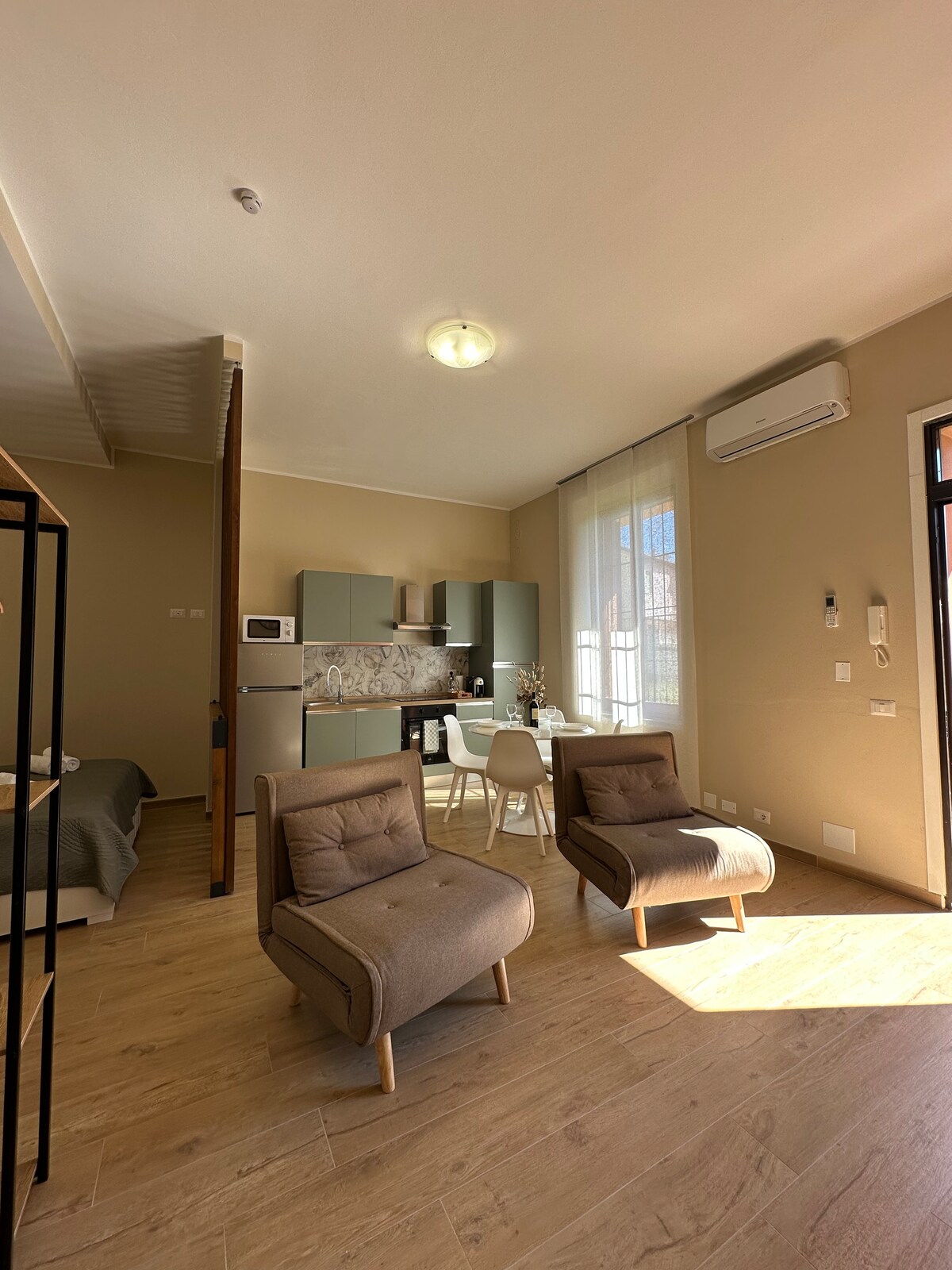 Wake up to the morning light in a historic building in Piazza Giovine Italia. High ceilings create a sense of space, while the living room, with wood paneling and a panoramic balcony, invites you to relax. The modern kitchen and dining area are perfect for intimate dinners, while the bedroom and spacious bathroom offer a serene retreat. A charming oasis where history and comfort meet, for an unforgettable stay.