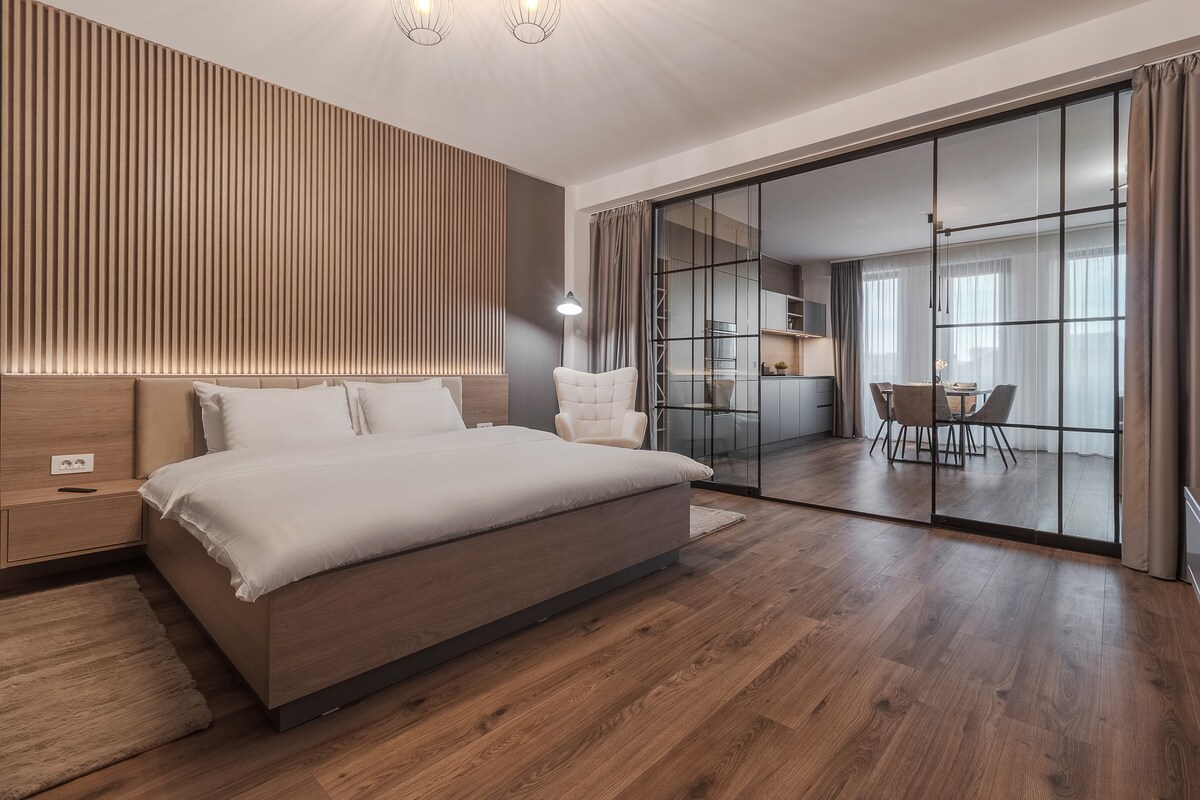 Descubre un espacio ultramoderno y versátil, a sólo 350m (5 min) de la Plaza Unirii.La pieza central es la pared de vidrio que separa el dormitorio de la sala de estar, equipada con cortinas opacas para una privacidad completa. Ideal para un máximo de 4 personas, este departamento ofrece una combinación perfecta de estilo y funcionalidad. - Cortinas opacas para el control de la luz. - Estacionamiento subterráneo incluido (acceso seguro). - Sofá extensible en la sala de estar - Baño moderno con ducha y TV inteligente. - Auto registro de entrada y wifi ultrarrápido.