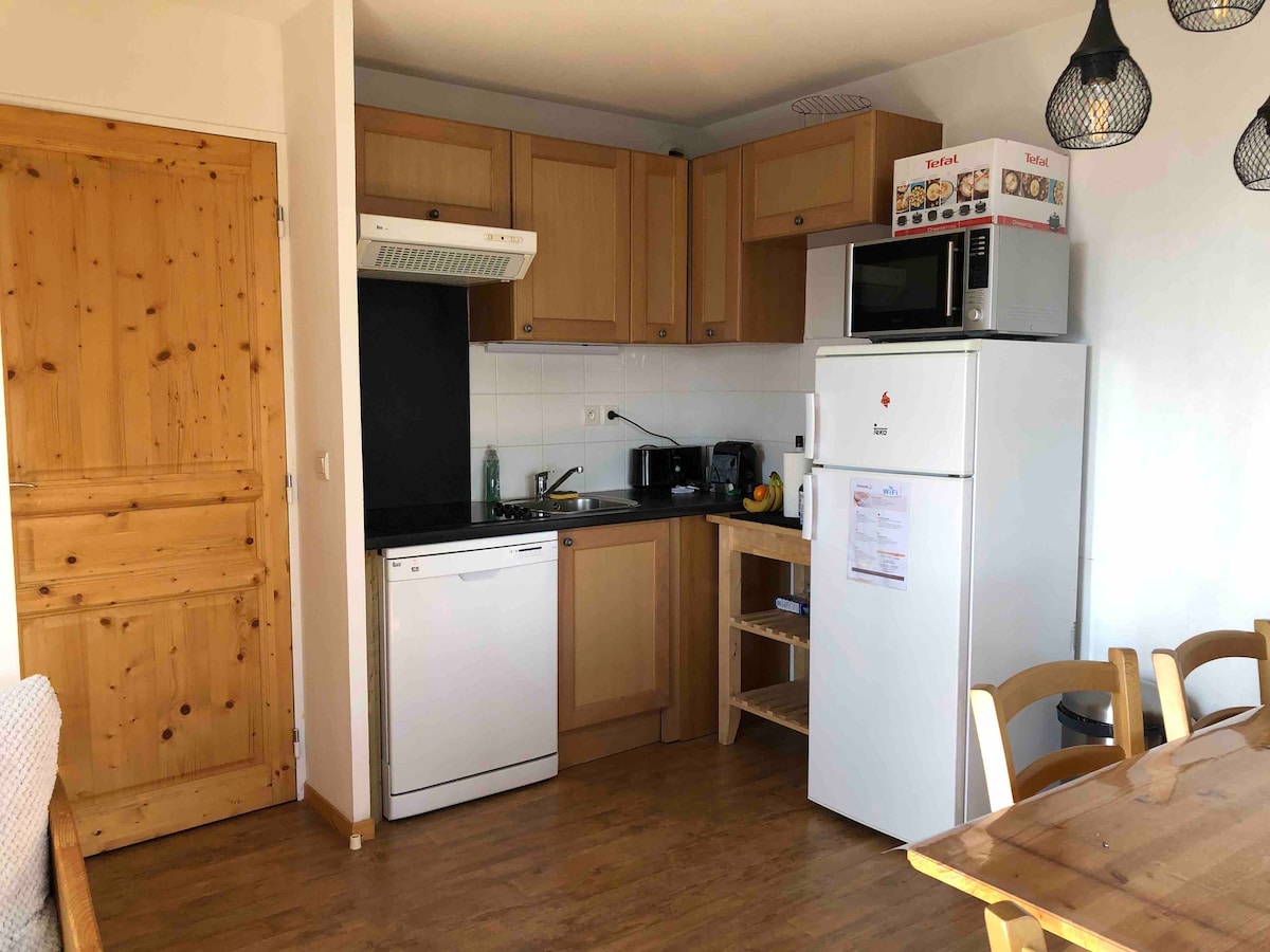 Hermoso apartamento orientado al sur para 6 personas tranquilo, residencia 3⭐️ Les Cristallines. Ascensores y estacionamiento privado cubierto. ¡Balcón panorámico en L con impresionantes vistas al valle! Cerca de tiendas y pistas. Sala de estar: cama nido, TV (TNT), WiFi gratuito. Dormitorio: 1 cama doble Cabina: 1 litera Zona de cocina totalmente equipada SDB con bañera, inodoro separado. Armario de esquís + garaje para bicicletas seguro. ¡Todo para una estancia inolvidable en la montaña en familia o entre amigos! 👍🦫🌲🌻