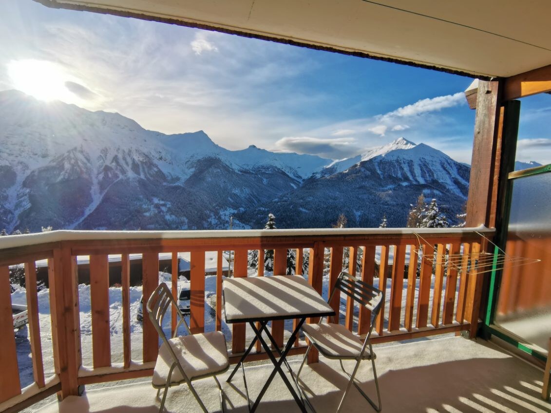 Estudio muy soleado grd balcón con impresionantes vistas a las montañas cerca de todos los servicios a 300 metros (remontes, piscina, bolera, pista de patinaje sobre hielo, restaurantes, cine, bares y salidas de senderismo) Cocina totalmente equipada, tv, baño y aseo separados, zona de montaña para 2 personas, un sofá cama convertible para 2 personas. Estacionamiento privado y armario para esquís. Se proporciona ropa de cama, excepto toallas de baño. No se admiten animales.