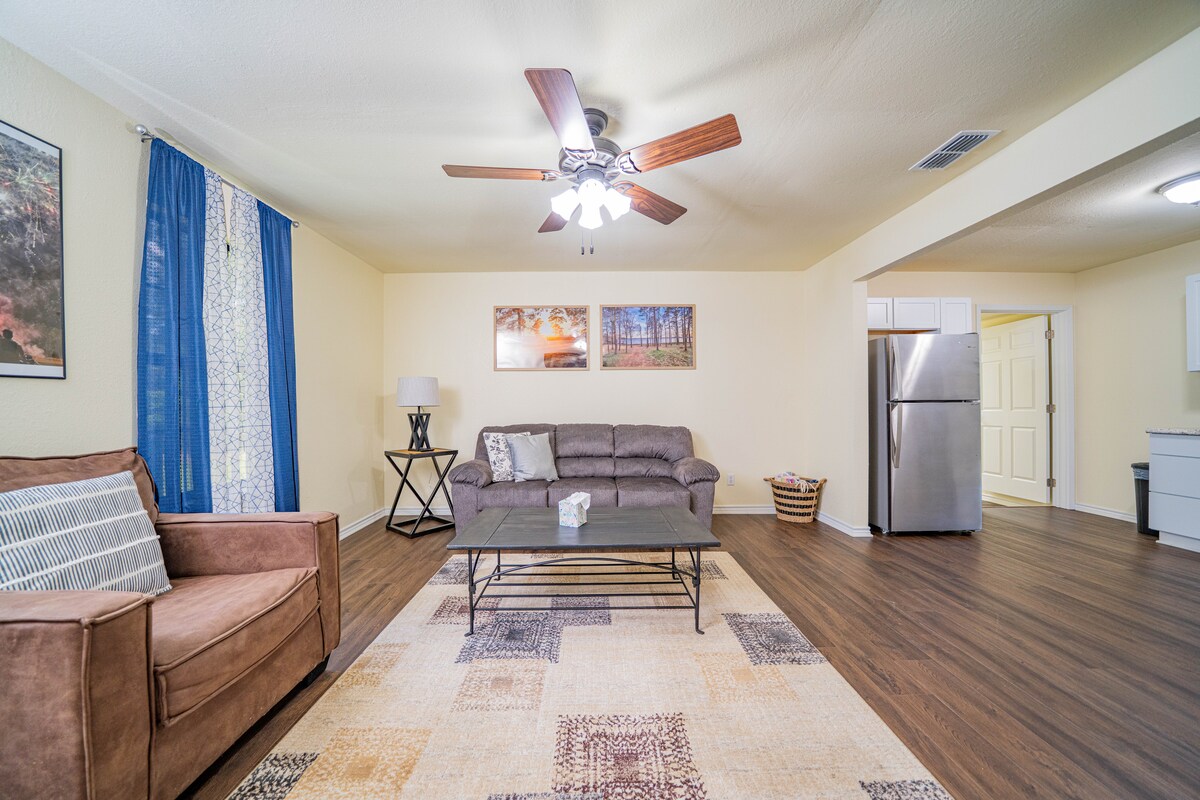 Ven a disfrutar de la tranquilidad y el silencio de nuestra hermosa propiedad. Te encantará los porches profundos con las mecedoras y el columpio del porche. Disfruta de una hermosa puesta de sol, juega al cornhole o enciende un fogón en la chimenea en la gran zona común. El Redwood tiene una planta abierta con mucha luz natural. Te encantará la ducha de lujo a ras de suelo con varios cabezales de ducha. Luego descansa cómodamente en la cama tamaño queen con sábanas de lujo.