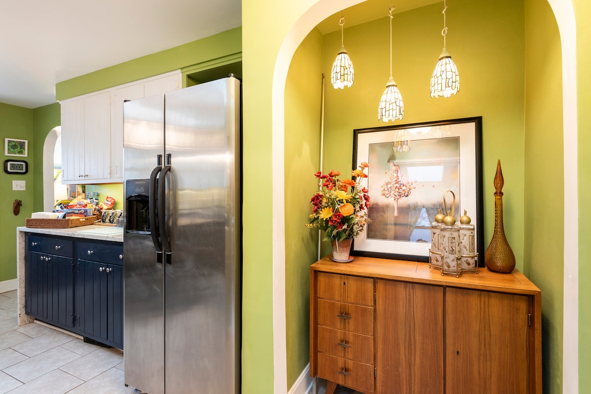 Relájate en un elegante sofá modular de mediados de siglo en medio del estilo retro, las obras de arte eclécticas y los techos abovedados dentro de esta cautivadora casa de estilo loft. Prepara la cena en una cocina con superficies de esteatita y cena al aire libre en una mesa de la vieja escuela en el patio. Completamente renovado con ropa de cama de hotel de lujo nueva, manteniendo las maderas originales y el encanto de esta casa antigua. Dos dormitorios en el primer piso y dos en el segundo, fácil acceso para todas las edades. A 10 minutos del centro de la ciudad y del Centro de Exposiciones.