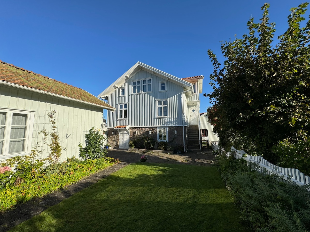 Ett klassiskt Bohuslänskt hus med stor altan och nära till bad och allmänna kommunikationer. Stor öppen planlösning, storstuga, där kök, vardagsrum och matveranda hänger ihop och med vedspis centralt i huset. Sovrum och toalett/dusch med tvättstuga på nedre plan. Övervåning med toalett/badkar, 3 sovrum och ett allrum med dörr ut till balkongen. Stor altan och gräsmatta mot syd. 4km till mataffär i Mollösund, 10min till bad.