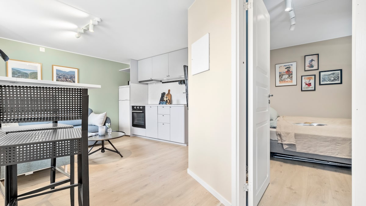 Apartamento recién renovado en un entorno tranquilo con patio soleado y plaza de aparcamiento privado gratuito. A poca distancia del aeropuerto (7 min) y del centro de la ciudad de Bergen (15 min) en auto. Buena oferta colectiva a ambos lugares a 5 minutos a pie. El apartamento tiene unos 35 m2 y tiene un alto nivel. Calefacción por suelo radiante, cocina moderna, un dormitorio acogedor y baño nuevo con lavadora y secadora. También hay acceso gratuito a wifi y TV con Apple TV disponible en el departamento. Distancia a pie a tienda/restaurante (7 min).