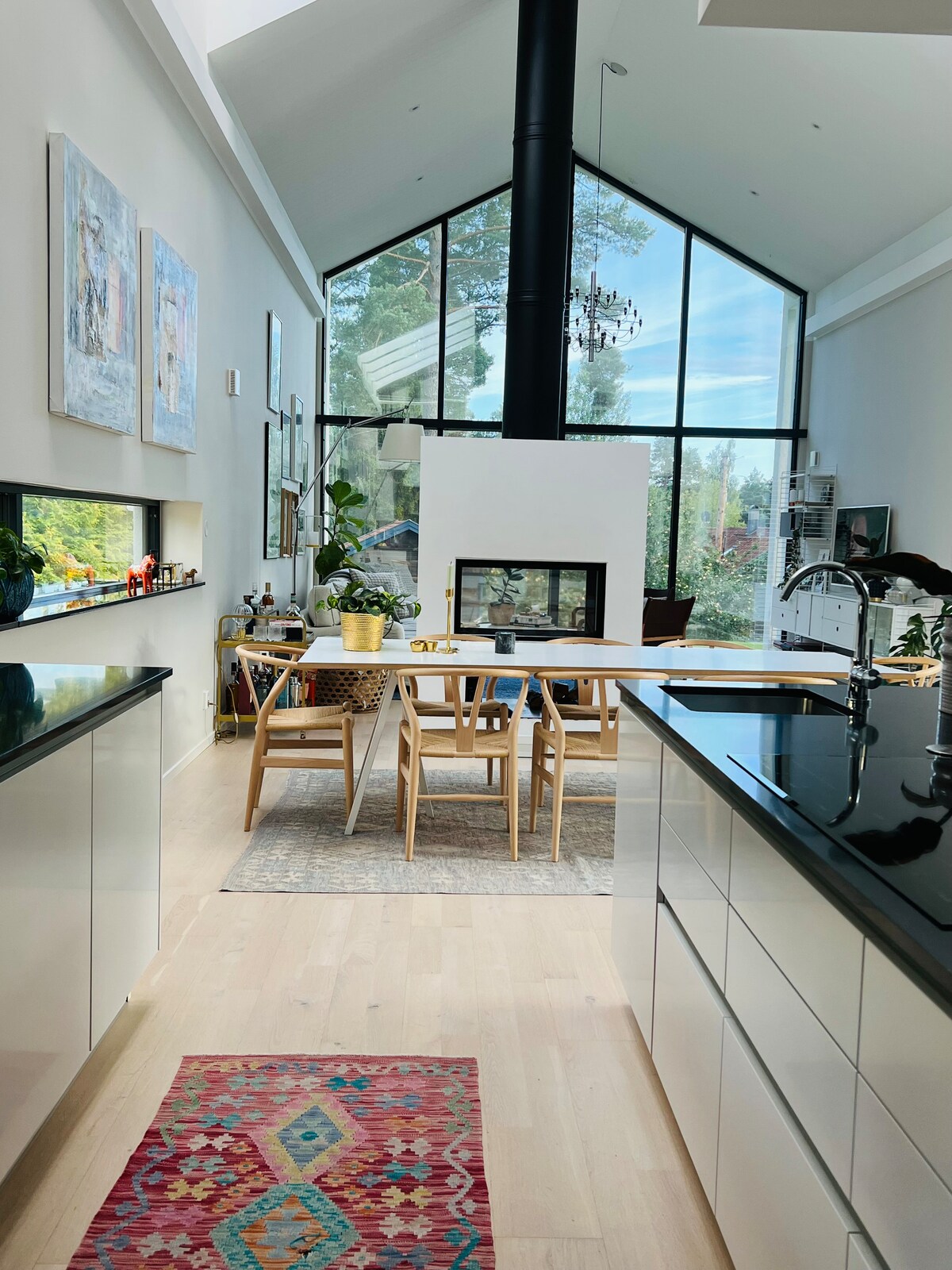 Esta villa de diseño arquitectónico con vistas al mar en Resarö es muy tranquila. La sala de estar tiene un techo de 7 metros de altura. Las zonas sociales son amplias con salón, cocina, terraza con barbacoa/horno para pizzas y una casa de spa/sauna. Casa de 290 + 30 m2. La piscina está abierta durante el mes de septiembre. No se permiten mascotas. Hay 3 dormitorios con camas dobles y baños en suite. Esta villa es un lugar para relajarse con amigos y familiares. Cerca de la naturaleza y del muelle de Estocolmo. Especialidades para estancias largas