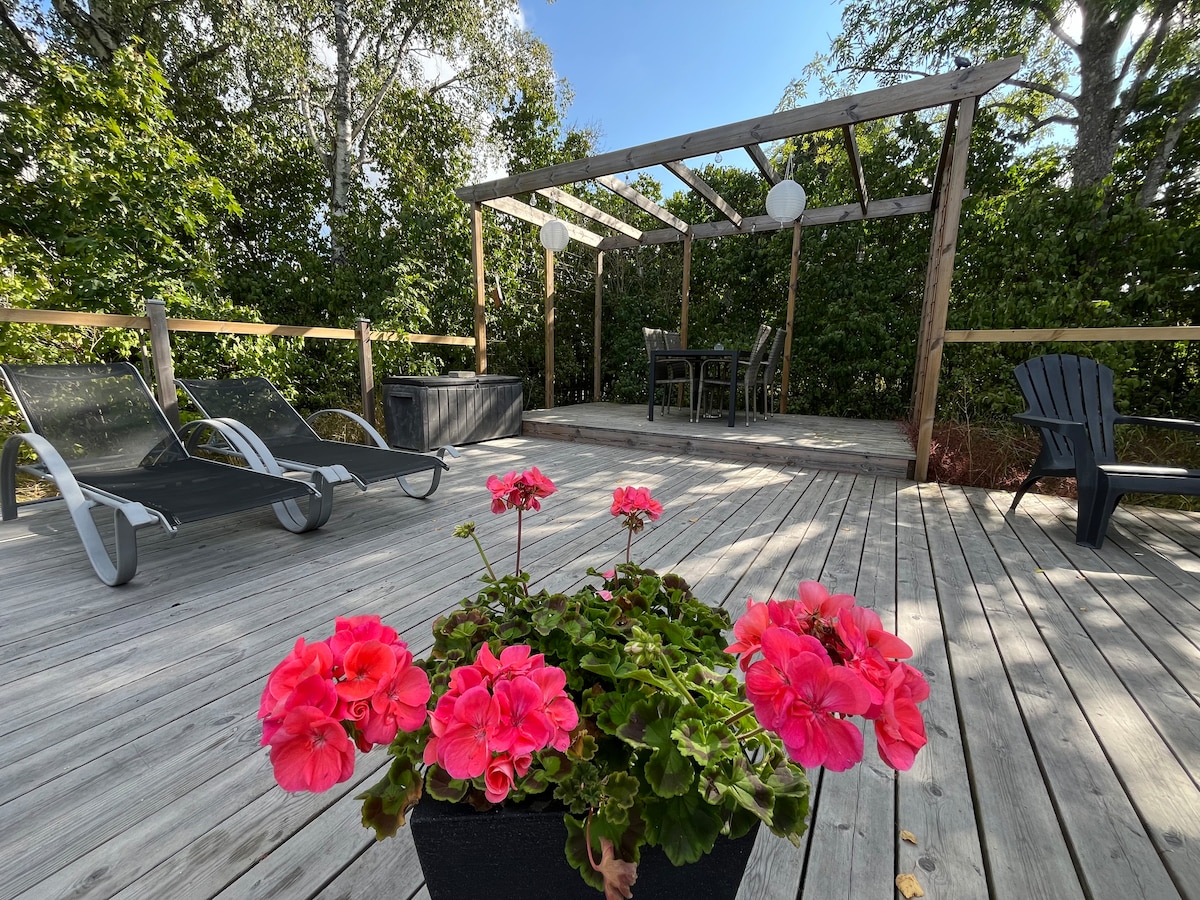 Casa de huéspedes con patio cubierto. En la misma habitación hay buenos lugares para dormir para cuatro personas divididos en una cama doble y un sofá cama. Se proporcionan sábanas y toallas. Cabina de ducha e inodoro. Una cocina pequeña con estufa, nevera con congelador, cafetera, hervidor y microondas. Banda ancha con WiFi. TV con Chromecast. Lavadora en otro edificio. Caja de carga para autos eléctricos. Estacionamiento también para vehículos más grandes. Te damos la bienvenida a tu llegada, o puedes hacer el check-in de forma independiente a través de la caja de llaves. ¡Te damos la bienvenida! Lennart y Annika