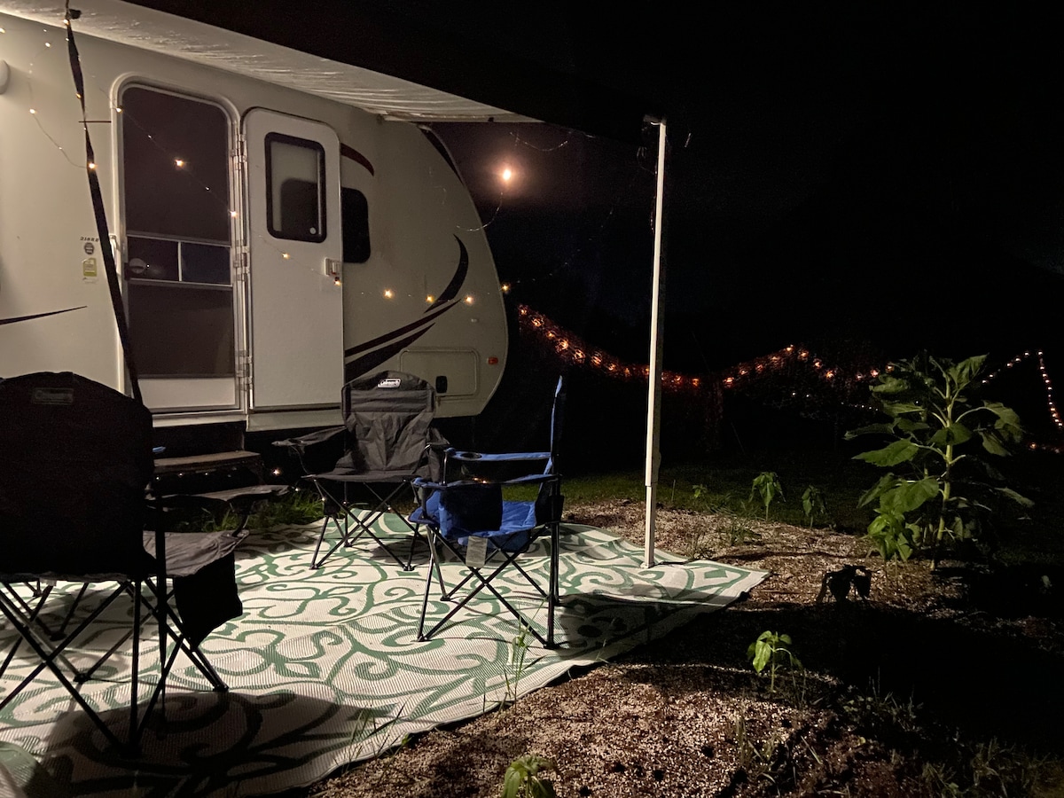 Nuestra única casa móvil de 35 pies Silver Star de 1953 está ubicada en el bosque a lo largo de una cresta con vistas a un campo de maíz, y está lista para acampar cómodo pero rústico. Destino perfecto para escapar y disfrutar de paz y tranquilidad mientras disfrutas de la belleza que te rodea. Se puede acceder fácilmente desde la entrada de la granja. Equipado con iluminación solar, una estufa de butano, agua potable y un inodoro de compostaje limpio a pocos pasos. También hay disponible una parrilla de gas y un fogón con muebles de exterior.