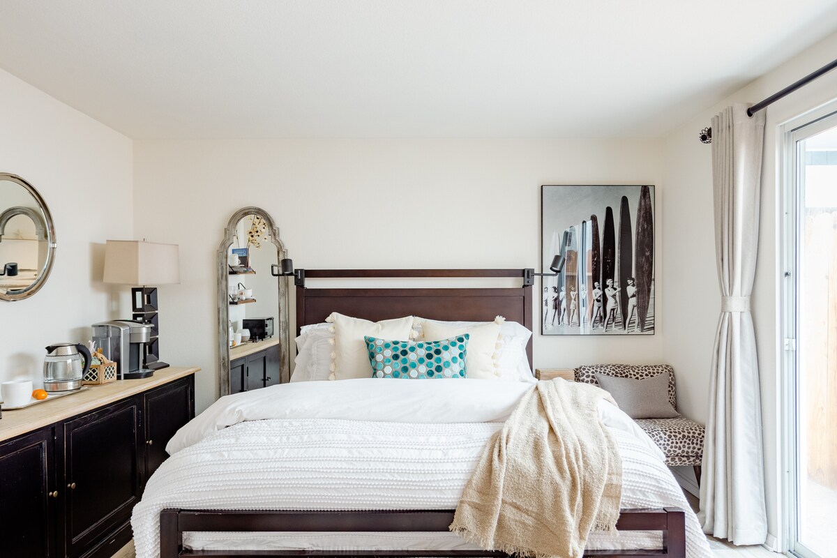 Relájate en este acogedor refugio costero de un dormitorio con brisas oceánicas, un televisor inteligente, un espacio de trabajo dedicado y un espacio privado aislado al aire libre. Los pisos de hormigón con acabado de cera de abeja pulida te conectan con el suelo para una estancia tranquila y reparadora. Limpiado siguiendo las pautas de los CDC con desinfección UVC adicional y un purificador de aire Dyson. Ubicado en una calle tranquila cerca del puerto, playas, surf, puestas de sol, avistamiento de ballenas y yoga local. Un espacio de estacionamiento incluido.