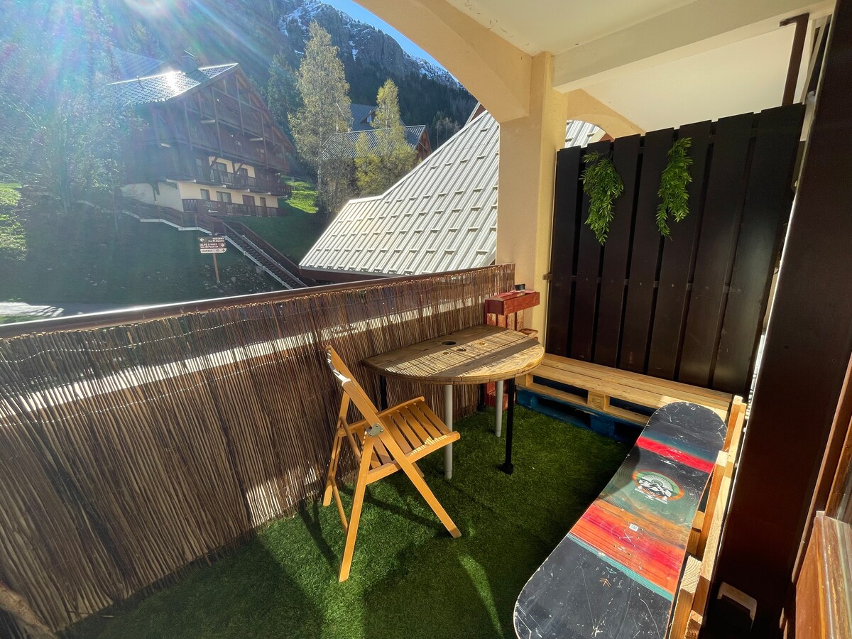 Estudio en el corazón de la estación, con terraza, que ofrece una vista despejada de los macizos. Ubicación céntrica a dos pasos de tiendas y actividades: alquiler de esquí, restaurantes, tiendas, pista de patinaje, bares, panadería, spar. Camas: - literas (90x190). - cama estándar colchón + somier (140x190). ATENCIÓN: no se proporcionan sábanas y toallas. La entrada al alojamiento es autónoma con caja de llaves. Armario de esquís.