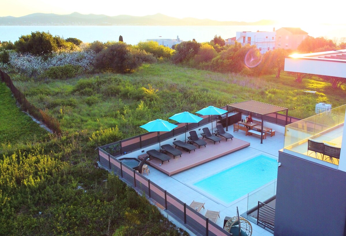 D-Art Villa es una propiedad vacacional exclusiva, una nueva experiencia vacacional de lujo en Bibinje-Croatia. Nuestra propiedad tiene 5 apartamentos modernos y elegantes, todos con las mejores características de una casa inteligente de nueva edad. Este departamento de tres dormitorios está ubicado en el tercer piso de la propiedad y es cómodo para 5-7 personas. Las características incluyen una cama doble, aire acondicionado, wifi gratuito, una terraza en la azotea con jacuzzi y con vistas al mar, una zona de descanso junto al jacuzzi y mucho más.