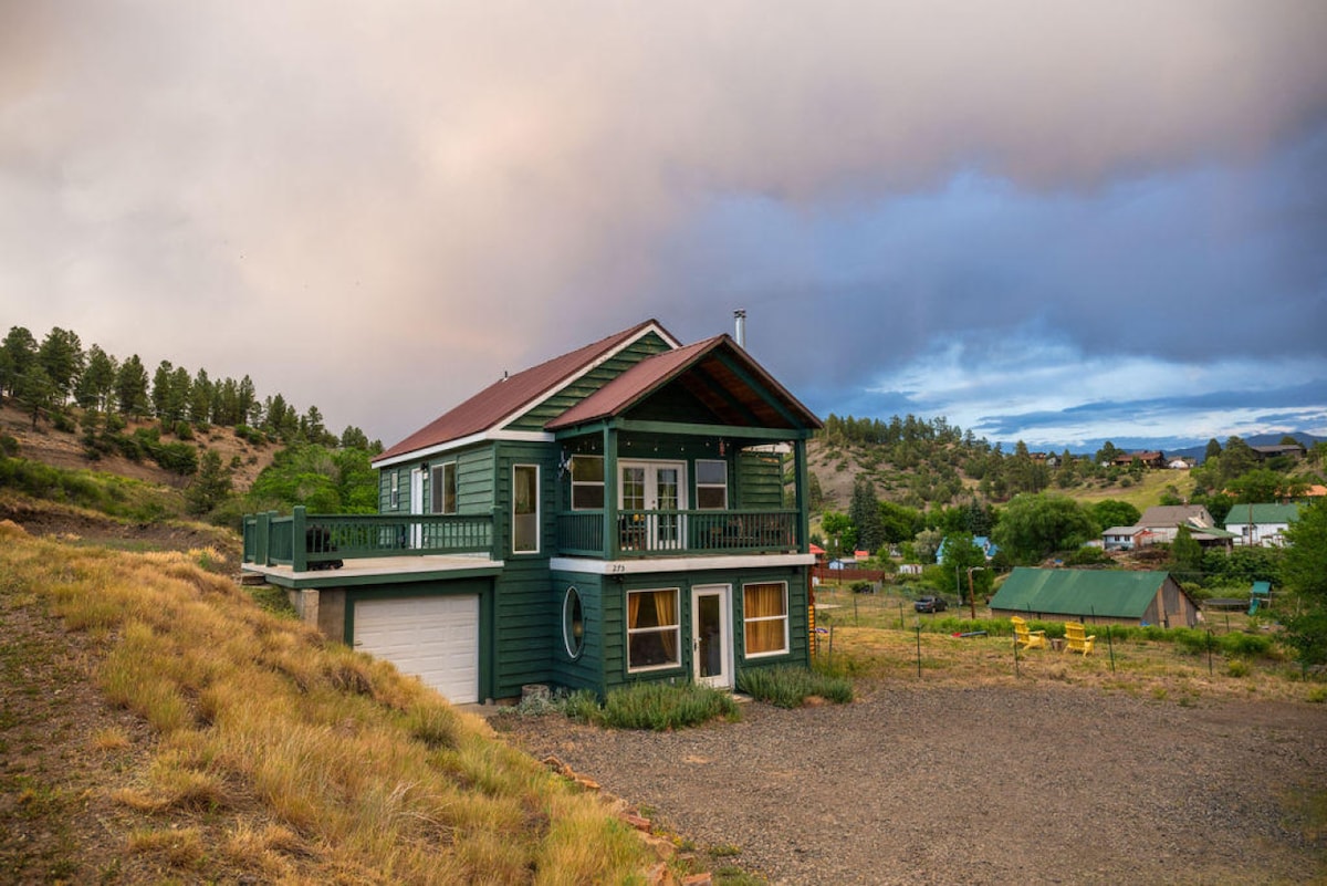 ¡Te damos la bienvenida a nuestra casa de huéspedes! Ubicada en el lote inferior de nuestra propiedad, esta nueva casa de 800 pies cuadrados tiene todo lo necesario para disfrutar de nuestra encantadora ciudad de montaña. Este pequeño castillo personalizado tiene muchas ventanas para disfrutar de las grandes vistas a la montaña y fue construido con materiales locales y de recursos. Puedes salir por la puerta al sistema River Walk (a solo dos manzanas del río San Juan) o disfrutar de un paseo de un cuarto de milla por la acera pavimentada hasta nuestras mundialmente famosas aguas termales y el corazón de nuestro centro de la ciudad.