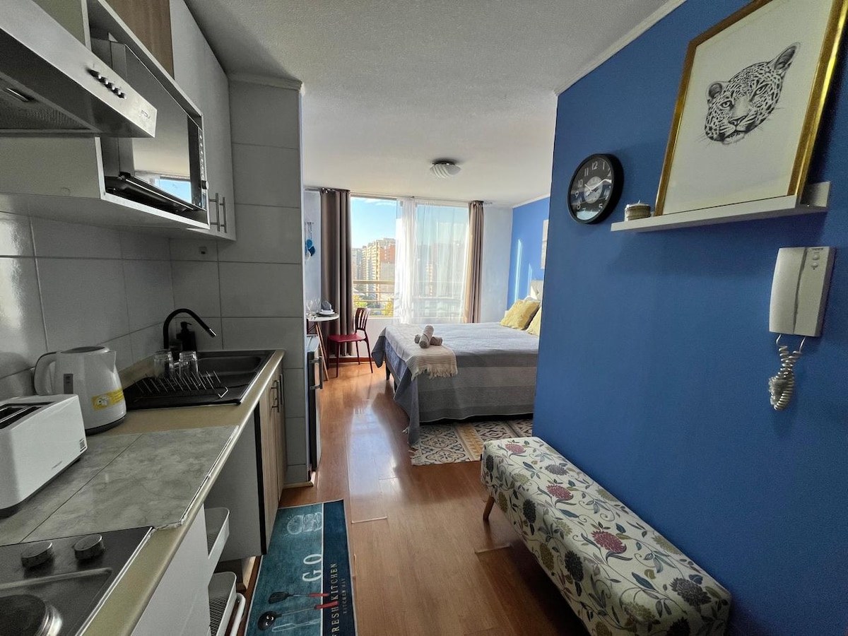 Disfruta este Home Studio cercano a Movistar y con conectividad en el centro de la ciudad. Espacio funcional con: Dormitorio, Baño (toallas ducha), Cocina equipada/Zona de trabajo/WIFI, Smart TV. - A pasos de metro Parque Almagro, paseo Bulnes, supermercado, Universidad Central, cercano a comercio, teatro Caupolicán, hospitales. - Cercanía a Movistar Arena (7 min./vehículo, 20 min./pie) Registra tus datos en conserjería e ingresa mediante cerradura electrónica y código de acceso check-in 24/7.