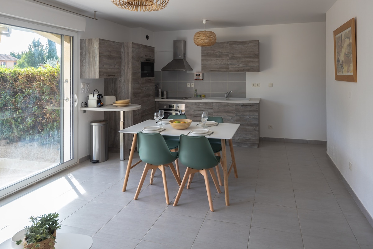 A pie del centro de la ciudad, se alojará en una luminosa y tranquila planta baja del jardín de 45 m2 con aire acondicionado. Su terraza totalmente equipada de 25 m2 sin vecinos con persiana eléctrica y su plaza de estacionamiento privado le permitirán disfrutar plenamente de la dulzura de la vida provenzal. Cuna de viaje con manta y trona disponibles. Ideal también para trabajar excelente conexión a internet por fibra óptica, plancha y tabla de planchar. Se admiten animales bien criados con mucho gusto.