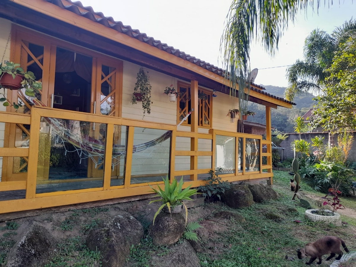 Casa de piedra y madera, 2 pisos; en la planta baja: cocina, baño completo, sala con grandes ventanales y balcón, brindan al huésped con la vista de la exuberante naturaleza que rodea el Refugio. En el piso superior, 1 dormitorio con cama doble, cuarto de baño (bañera de inmersión y lavabo), balcón con hamaca; al lado, dormitorio con dos camas, balcón con hamaca; en el lado opuesto, un dormitorio con litera (ver fotos). La comunión con el verde promueve un ambiente relajante, el sonido de los árboles, los pájaros y las flores, renuevan nuestras energías.