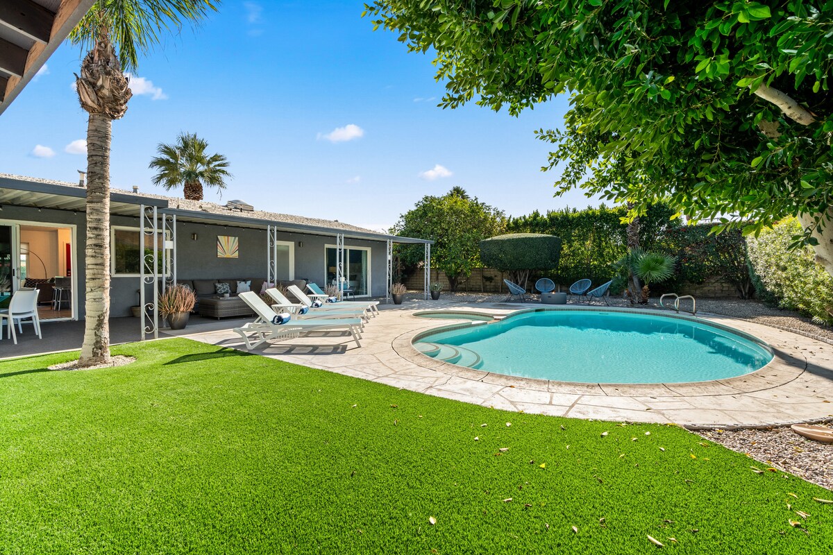 Nuestra casa de estilo de mediados de siglo está modernizada con buen gusto, conservando el encanto de su época. Tiene 4 dormitorios/3 baños (1 suite principal en la habitación principal, 1 en casita separada). El patio trasero tiene un ambiente retro de centro vacacional privado con un mural de pared pintado a mano, piscina de agua salada y spa, fogata de gas, barbacoa, flotadores de piscina, un toldo cubierto con amplios lugares para relajarse y un pomelo de más de 50 años. Nos gustaría hospedarte con un wifi muy fuerte, vistas a las montañas y aire fresco del desierto. La ciudad de Palm Springs ID #3033