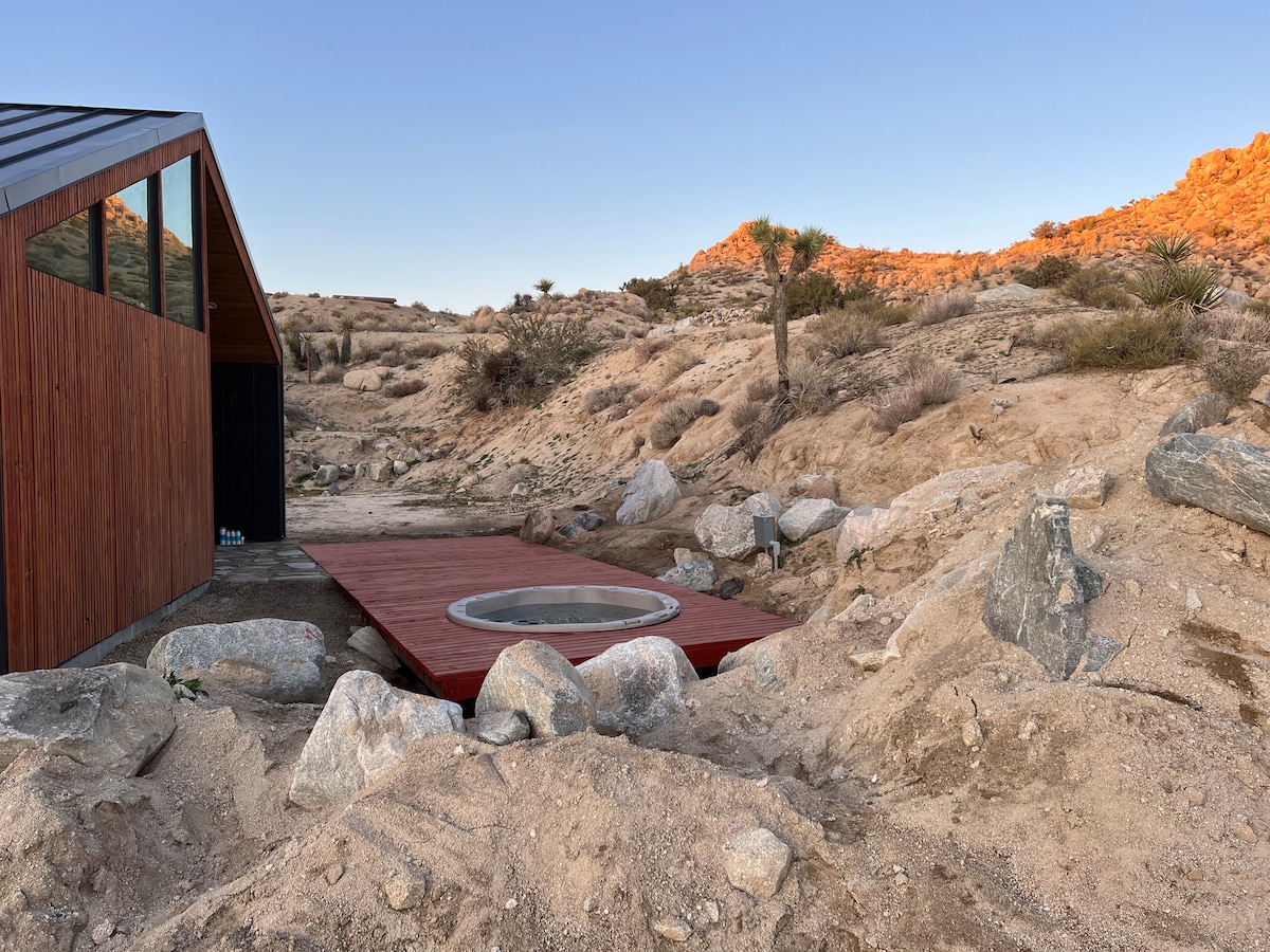 Moderna cabaña en el desierto doblada en 9 acres de rocas y cepillos. Los coyotes pasan como rumores. La codorniz patrulla las mañanas. Los lagartos reclaman las cubiertas antes del mediodía. La arquitectura es limpia, intencional, madera contrachapada, acero, cielo. Jacuzzi, ducha al aire libre, chimenea y Starlink (si los cuervos lo permiten). Cerca de Joshua Tree, el Integratron y Pappy & Harriet 's. Destacado en Dwell. Construido para la quietud. También se permite: STVR 362-22.