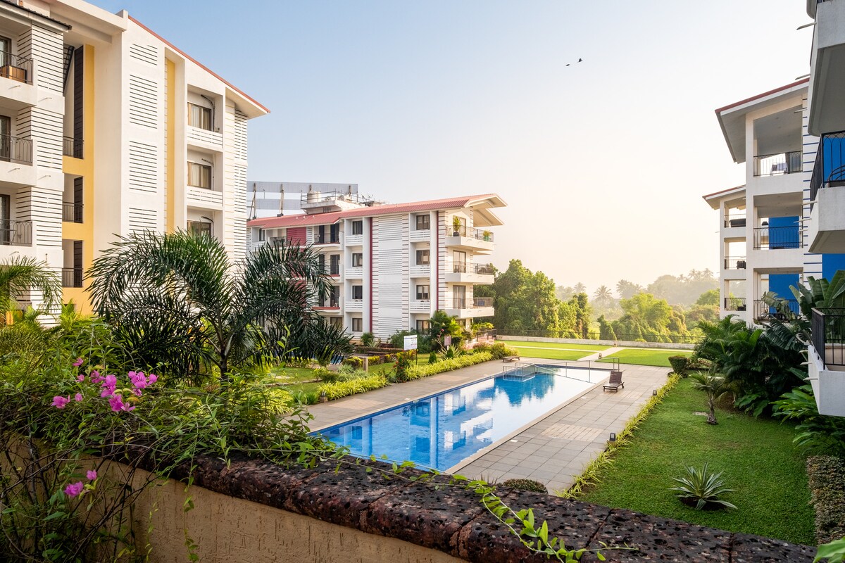 Noah: 1BHK Fieldview | Gimnasio | Piscina | 1 km de la playa de Baga