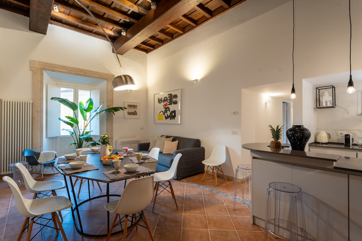 Luminoso y elegante apartamento con hermosas vistas a los tejados de Roma a solo unos minutos a pie desde el Panteón, Campo dei Fiori, plaza Navona y Piazza Venezia. Completamente remodelado con gusto y atención al detalle, es el lugar perfecto para disfrutar de la Ciudad Eterna.