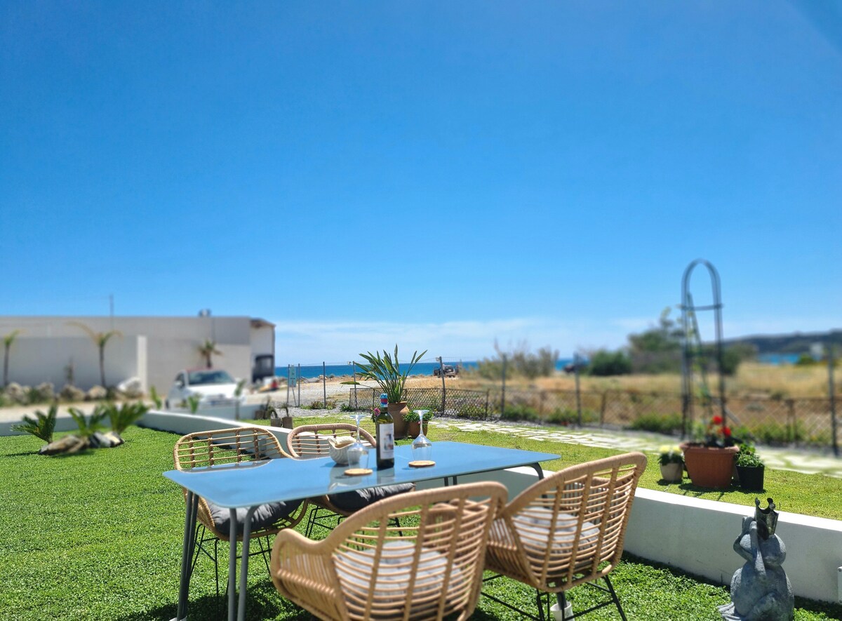 ESTILO EGEO Casa en planta baja con patio y césped alrededor, entrada independiente, familiar y acogedora, Entorno cómodo y tranquilo a solo 50 metros de la playa Con vistas al infinito azul del mar y en combinación con la decoración del interior y el exterior hace que el visitante se sienta como en casa