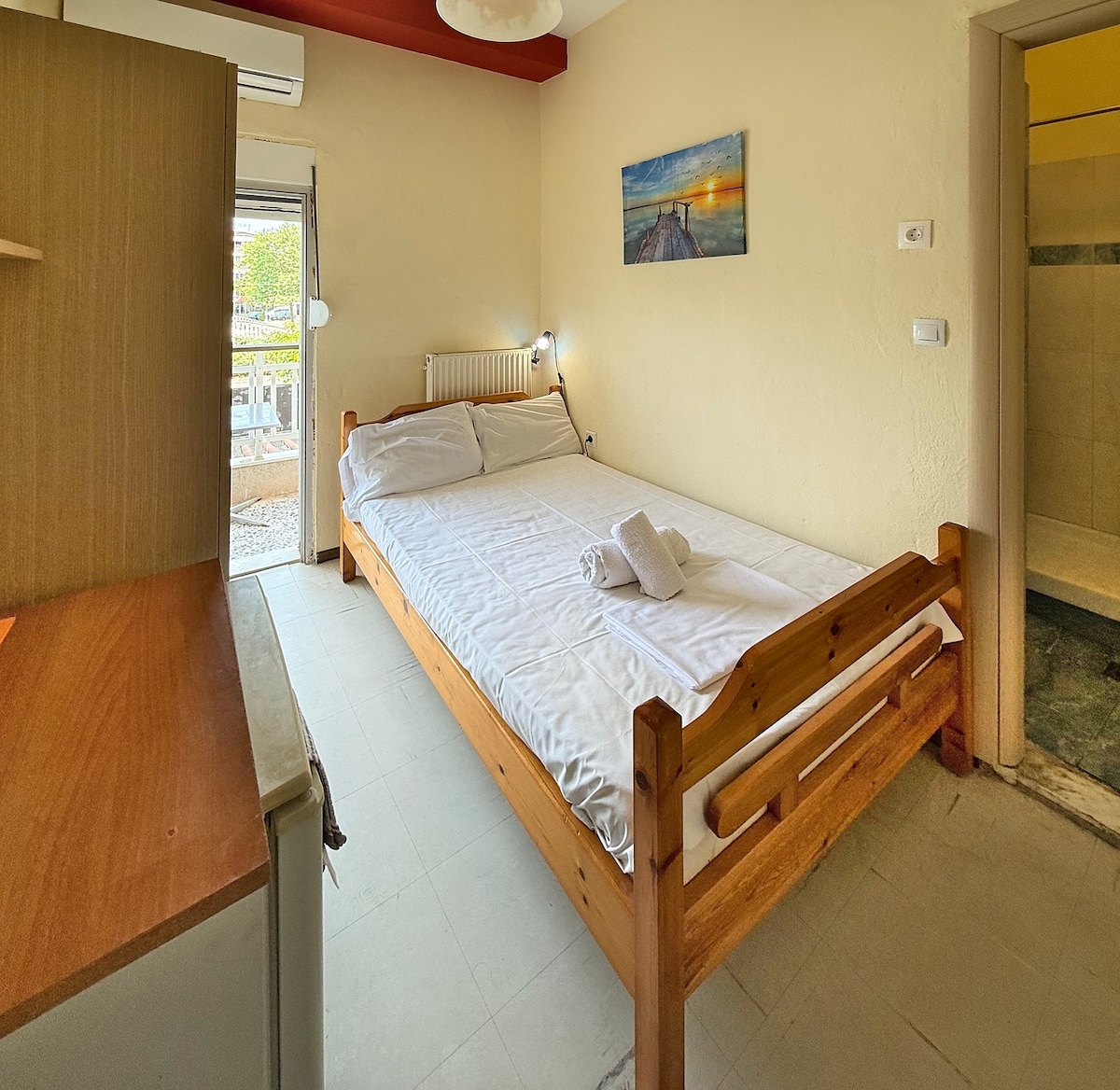 Una amplia cama doble en una acogedora habitación individual de un total de 14 metros cuadrados, con baño privado y balcón frente al parque más hermoso de Paralia Katerini.