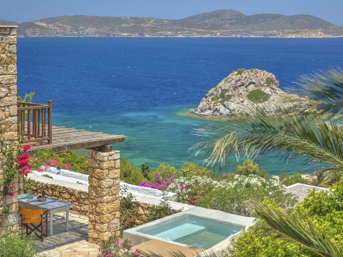 MHTE 1468K91000407501 Una casa de piedra de nueva construcción en la playa de Sapsila con una vista asombrosa, un lujo mínimo y un gran ambiente en una perfecta conformidad con la arquitectura tradicional de la isla. A unos 900 metros del puerto principal (Skala), la villa de piedra ofrece una cálida hospitalidad y el privilegio de estar a solo un respiro de la playa de arena a solo 15 metros de distancia. ¡Está diseñado de una manera que ofrece una comodidad única!