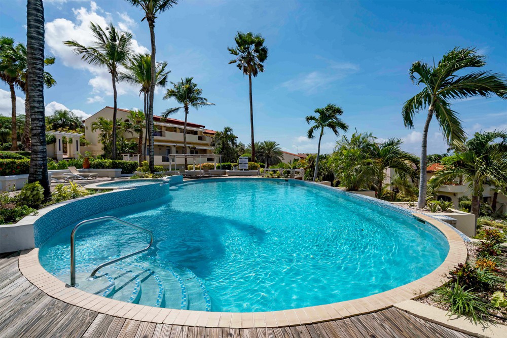 Complejo vacacional de playa caribeña con piscina y vista al mar en Curazao