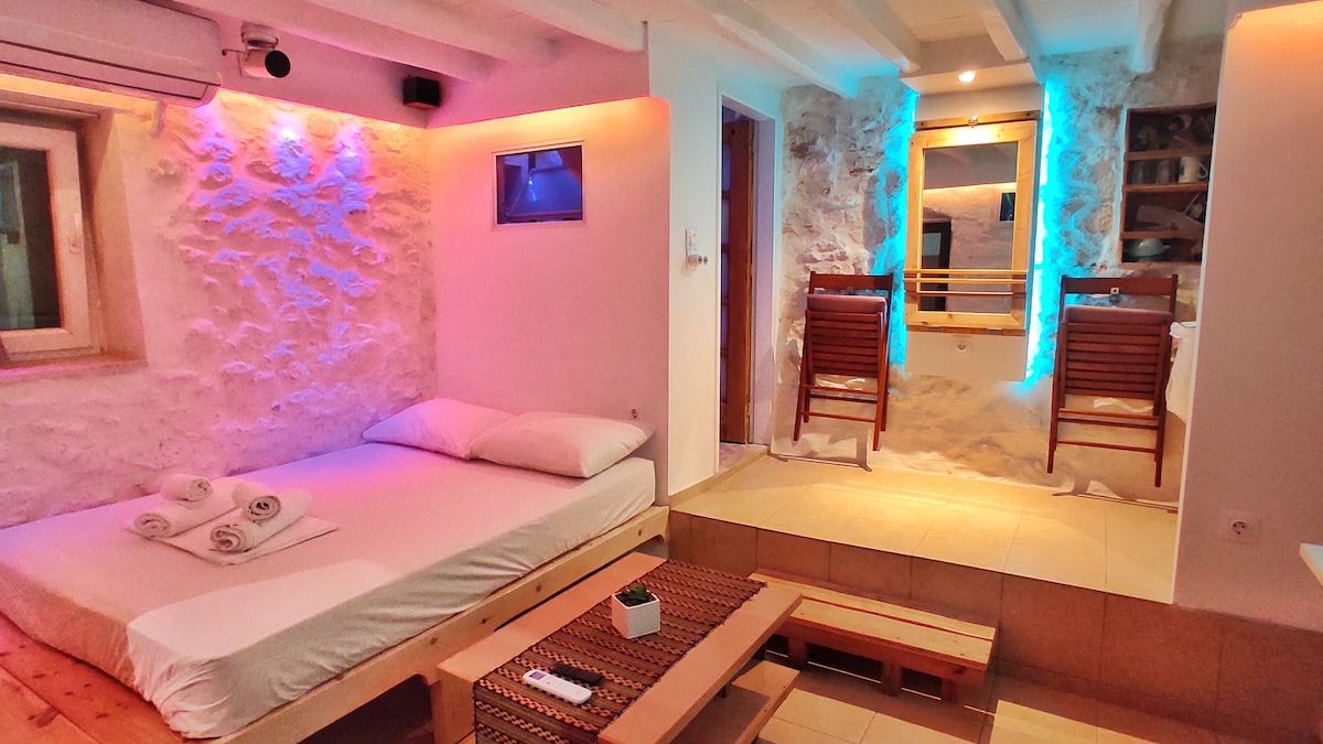 This picturesque house is built on a small peninsula, right above the water, facing the sea from both sides. You can enjoy the sea view simply lying in bed! The feeling of the sea penetrates you just by relaxing on the sofa, without even having to swim! The unique landscape, the quiet rhythm of life and the great food in this village of archaeological interest, will quickly fill you with calmness and relaxation. Advantage: quick refreshment of soul, mind and body. Free wifi 50 mbpps!!