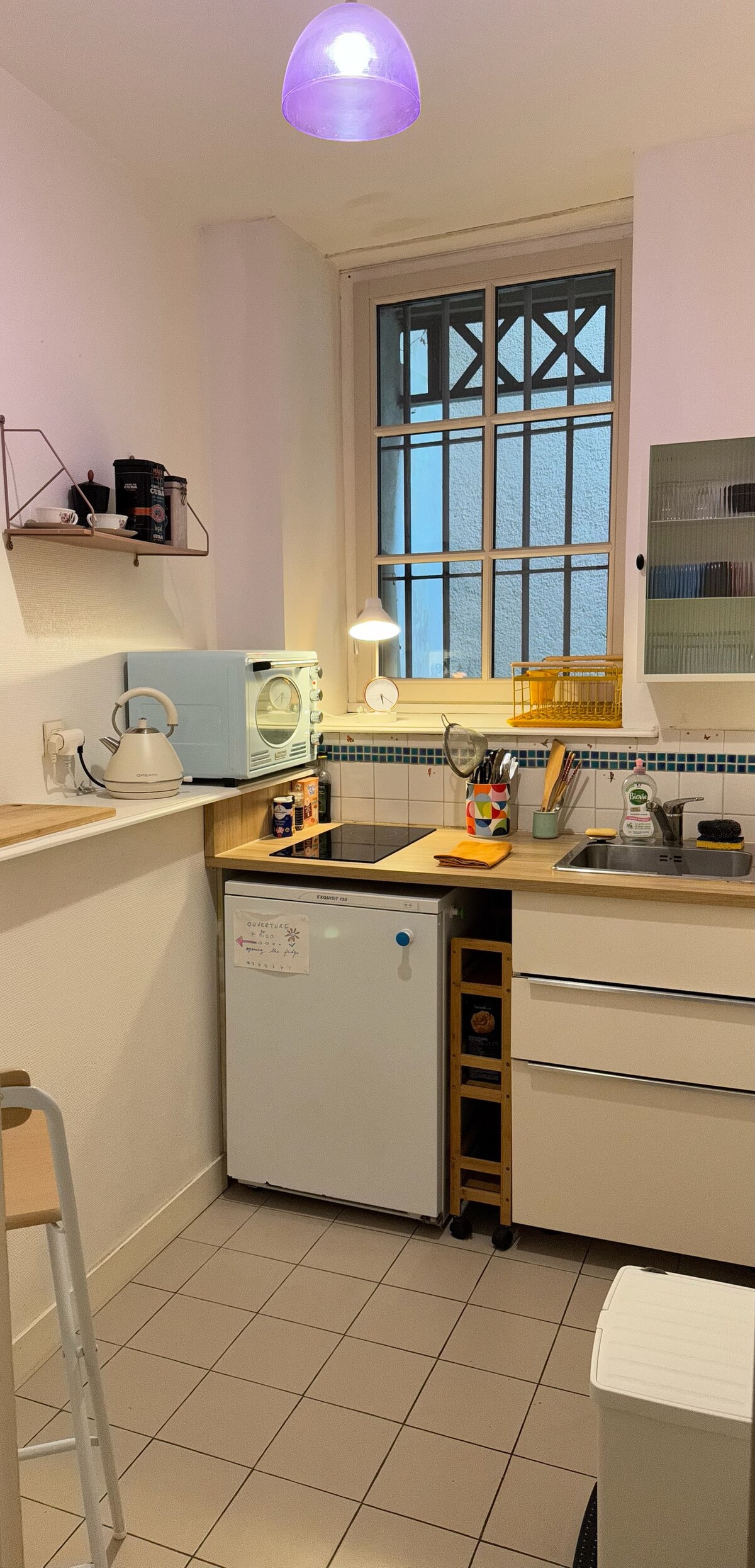 Encantador espacio ubicado en la parte superior de un apartamento dúplex, en una antigua casa de pueblo, situado en un tranquilo barrio residencial. Ubicado bajo el tejado (en el 3ᵉr piso sin ascensor), cuenta con todos los servicios (baño, aseo, cocina americana) y una entrada independiente. Bañado por luz natural, este espacio luminoso y acogedor ofrece un ambiente cálido y confortable, con muebles cómodos, tonos armoniosos y es apto para niños.
