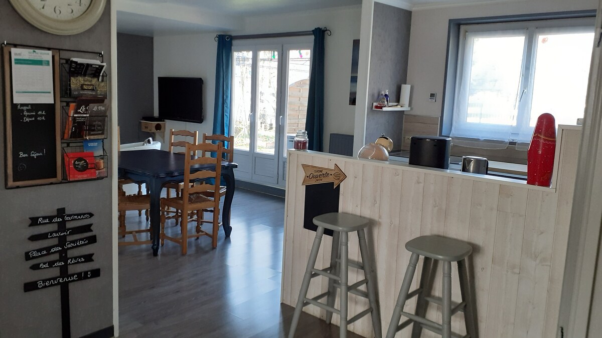 La casa pastel | Casa tranquila | Terraza | Jardín | Casa totalmente reformada y decorada con esmero en un estilo bohemio y colorido, situada en el centro de Brette les Pins, a 10 minutos del circuito de las 24 horas y a 20 minutos del centro de la ciudad de Le Mans. ¡Ideal para una estancia relajante en familia o con amigos!