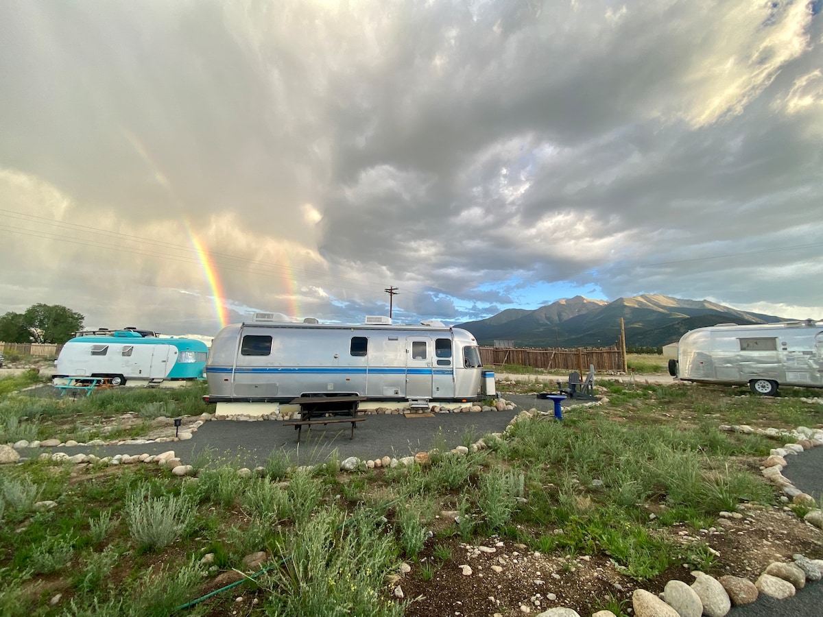 Bonanza Jellybean is a meticulously renovated 1989 Airstream, and likely the hippest, shiniest trailer you’ll ever lay your eyes upon. With a king bed in the back and a convertible sofa in the front, she’s big enough to host two couples or even a family, but her romantic vibes also make for a rocking good time for you and your lover. Glamp with the best views you’ll find in Colorado, just minutes from hiking, hot springs, and even downtown Buena Vista. Heated and haute all winter long!