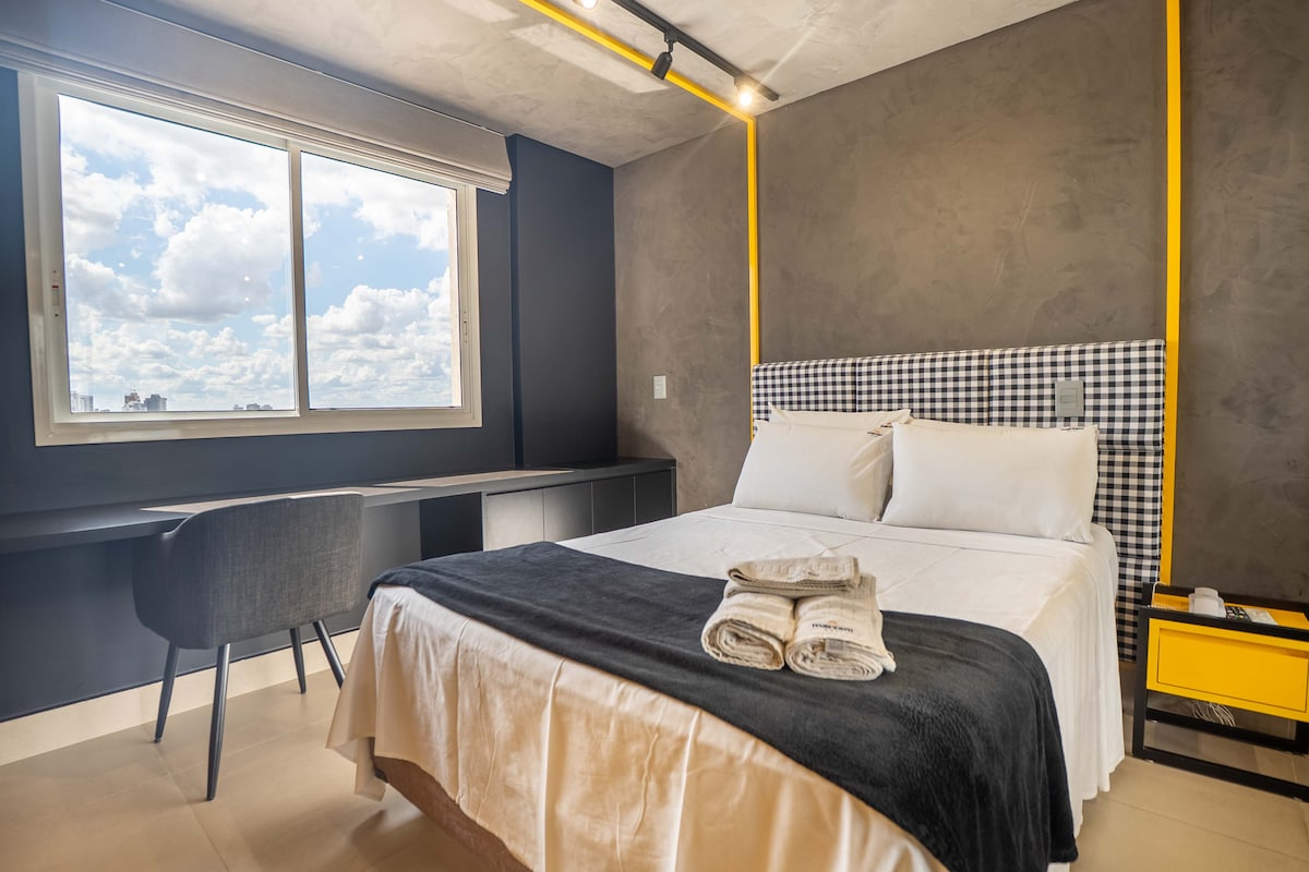 Loft de alta gama. Hospitalidad americana Cama queen, colchón de látex y muelles. Cocina completa para cocinar con varios electrodomésticos. Tiene aire acondicionado Ideal para trabajar: escritorio, silla ergonómica, WiFi de alta velocidad (400 Mb). Se proporcionan toallas y sábanas. Es necesario enviar el documento de identificación de los huéspedes, que solo pueden entrar en el condominio con estos datos del documento.
