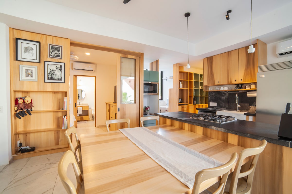 Un departamento fresco y moderno para unas vacaciones inolvidables con la familia o para trabajar en smart working. Decorado con detalles preciosos que te harán sentir como en tu propia casa. Equipado y con servicios de alta calidad: internet 200mbps, lavadora/secadora, smart tv, agua caliente y aire acondicionado. Se ubica a 2 minutos caminando de la playa Santa Cruz y cerca de restaurantes, tiendas y mercados. Además cuenta con un rooftop común desde donde se alcanza a ver el océano.