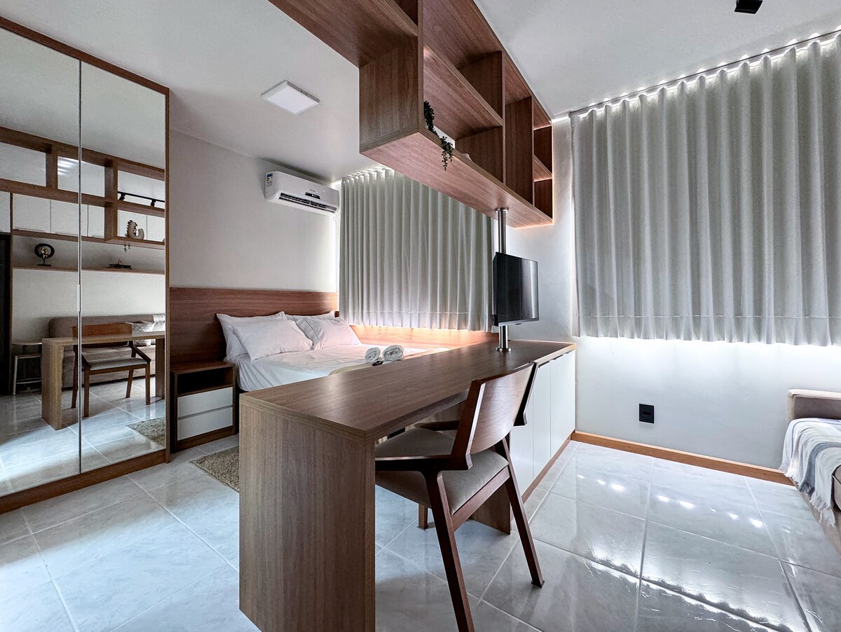Estudio sofisticado, acogedor, decoración personalizada y balcón en 45m². Todos los artículos para su estancia. Aire acondicionado split, Smart TV, Wi-Fi, lavavajillas, lavadora y secadora, bodega, microondas. Recepción 24 horas, lavandería y una plaza de aparcamiento cubierta. En el exterior del edificio, panadería para el desayuno, farmacia, un bistró, gimnasio. Mercado cerca de 200 metros y otras opciones gastronómicas. Noroeste es un barrio de alto nivel en Brasilia. Se encuentra a 6 km del Congreso. 23 km del Aeropuerto.