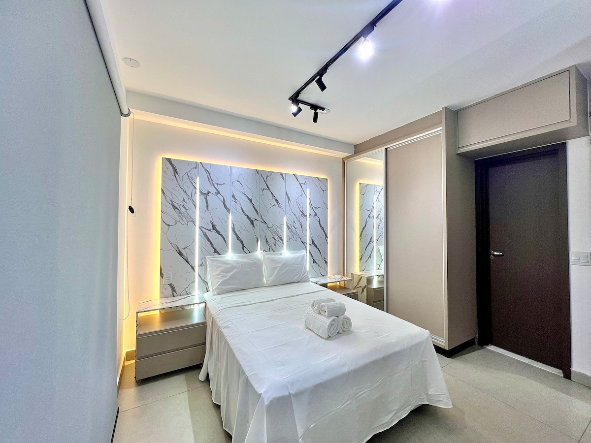 ❗️Un nuevo🤩 condominio único, elegante y sofisticado, hecho para que te sientas como en casa. Mira tu película favorita en el dormitorio o la sala de estar en el televisor inteligente giratorio más moderno con aire acondicionado, mesa de comedor y espacio de trabajo. ¡Descansa en la mejor cama, deleita con la ducha más deliciosa, disfruta del balcón y de una hermosa puesta de sol con vistas al parque y disfruta del contemporáneo Setor Bueno en la mejor región de Goiânia ! Condomínio Tai Residências