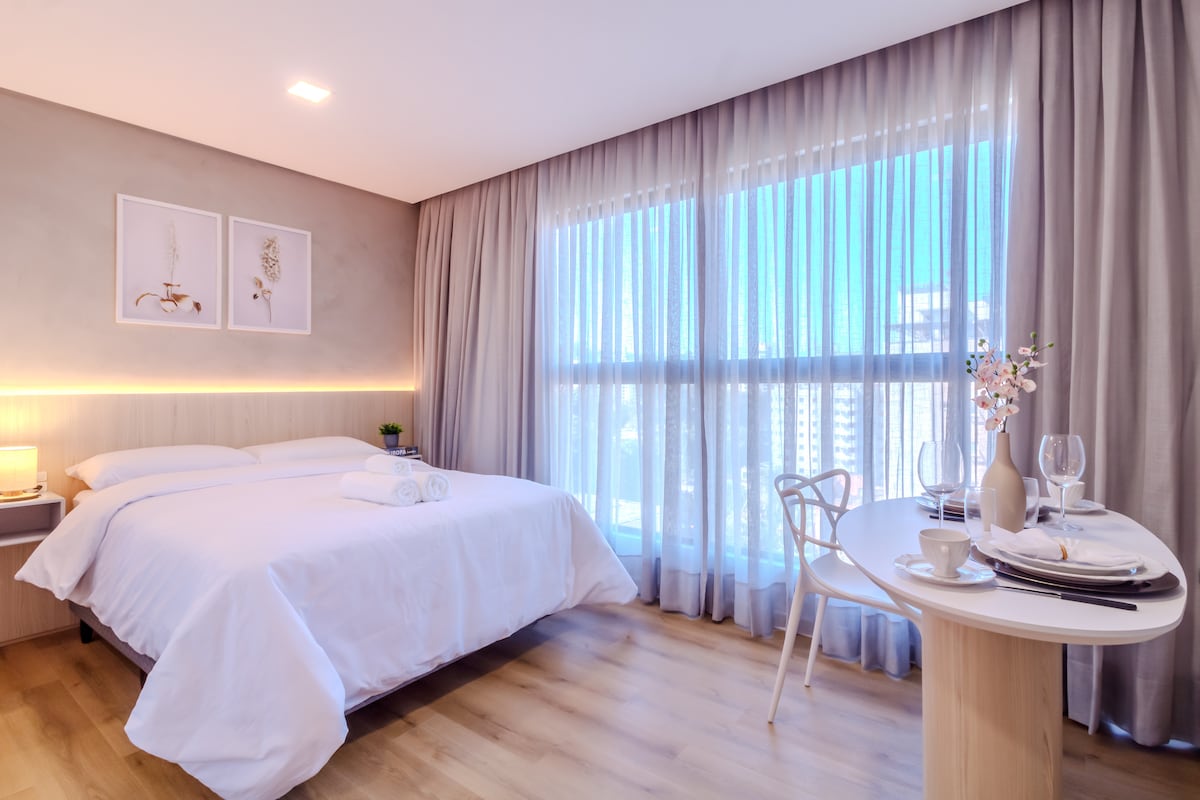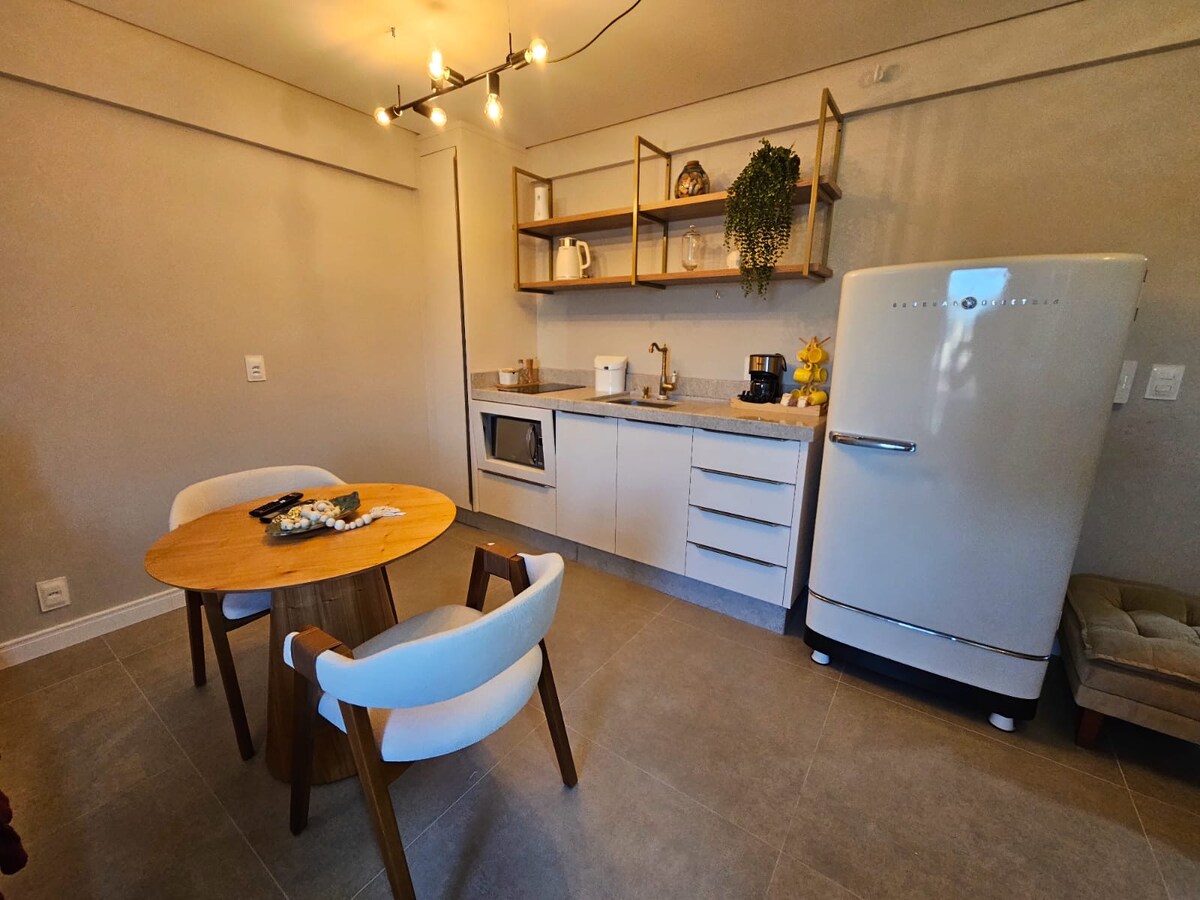 Sofisticado apartamento tipo estudio ubicado a 800 metros del parque Vila Germânica, lugar de eventos como el Oktoberfest. Rodeado de restaurantes, bares y supermercados. Todo para su comodidad: Smart TV 50" Samsung, aire acondicionado split, ducha de gas, wifi fibra 240mb, cocina completa con heladera Brastemp, microondas, horno, estufa, campana extractora, cafetera, purificador de agua, lava y seca, armarios, y por supuesto ¡una cama queen con el mejor colchón!