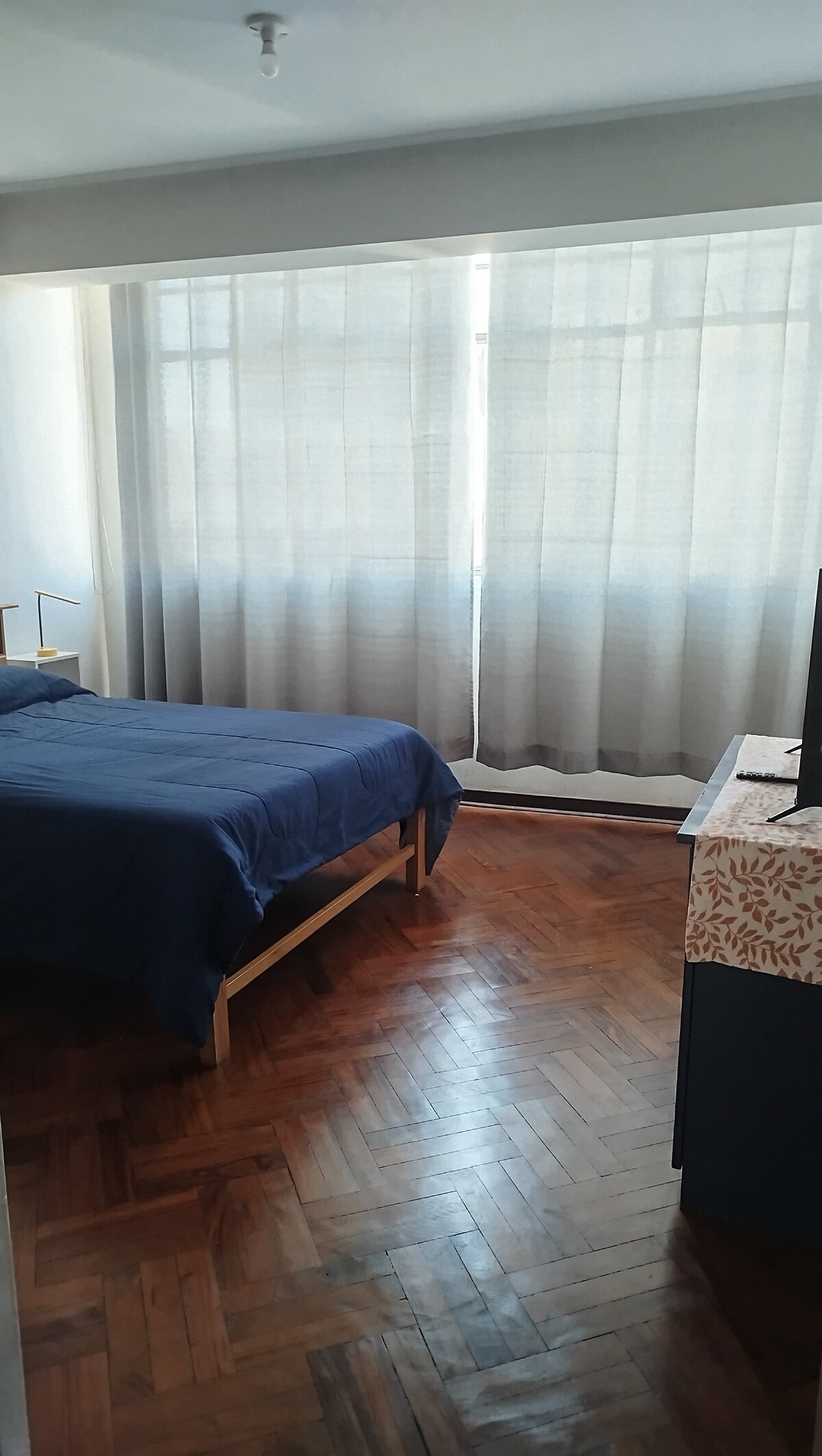 CÉNTRICO ESTUDIO DE 26 m2 CON UBICACION Y VISTA PRIVILEGIADA AL JARDIN BOTANICO DE TACNA, a pasos de lugares de interés de Tacna, cuenta con kitchenette con electrodomesticos, frigobar, mesa comedor, cama Queen, TV 43" con canales de cable, servicio higiénico privado equipado con tocador y ducha con hidromasaje. También cuenta con lavandería y tendal propio, armario, WIFI, caja de seguridad. Propiedad ubicada en quinto piso, con acceso independiente solo por escaleras amplias y con pasamanos.