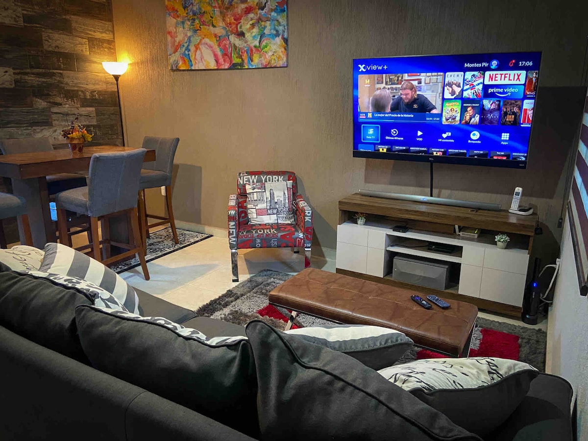 Disfruta de tu visita en Querétaro en un super departamento amueblado y muy cómodo por sus amplios espacios. Sala, comedor. 2 recamaras. 1 cama KS, 1 cama Mat y 1 sofá cama Mat. Ventiladores. Cocina equipada. 2 baños completos. WiFi. TV cable. Soundbar BT en Sala. Alexa. Lavasecadora. Balcón c/ mesa y sillas para 2 personas. Estacionamiento 2 autos. Vigilancia 24 hrs en condominio cerrado. Cerradura electrónica Smart. Plaza Antea y Uptown (8min). A 15min de zona centro. A 25min del aeropuerto.