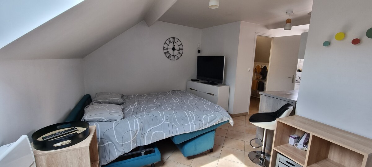 Encantador estudio independiente totalmente equipado con terraza privada. Completamente nuevo. Con módem 4G, TV, módem SFR, Netflix, altavoz bluetooth,cocina totalmente equipada, vajilla y utensilios, microondas, cafetera, nevera, horno, placas eléctricas, etc., 1 cama doble en el altillo y 1 sofá cama para dormir todos los días con colchón Dunlopillo. Adecuado para profesionales en viaje de negocios. Cocooning y descubrimientos. Bien comunicado, estación de tren, autopista, carretera de circunvalación cerca. A 20 minutos de Compiègne y a 1 hora de Amiens o París.