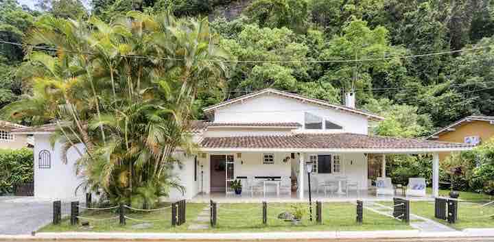 A solo 100 metros de la playa, una casa amplia, encantadora y superequipada, perfecta para familias con niños, personas mayores y mascotas. 4 dormitorios (con una suite en la planta baja, ideal para personas mayores), la casa tiene capacidad para 10 personas. Con una chimenea, un enorme jardín con césped e incluso una casa del árbol. Cocina completa, habitaciones bien amuebladas y aire acondicionado en todas las habitaciones. La ama de llaves (una gran cocinera) vive en la propiedad y está lista para ayudar con todo. A 165 km de São Paulo. Tranquilidad total, privacidad y comodidad.