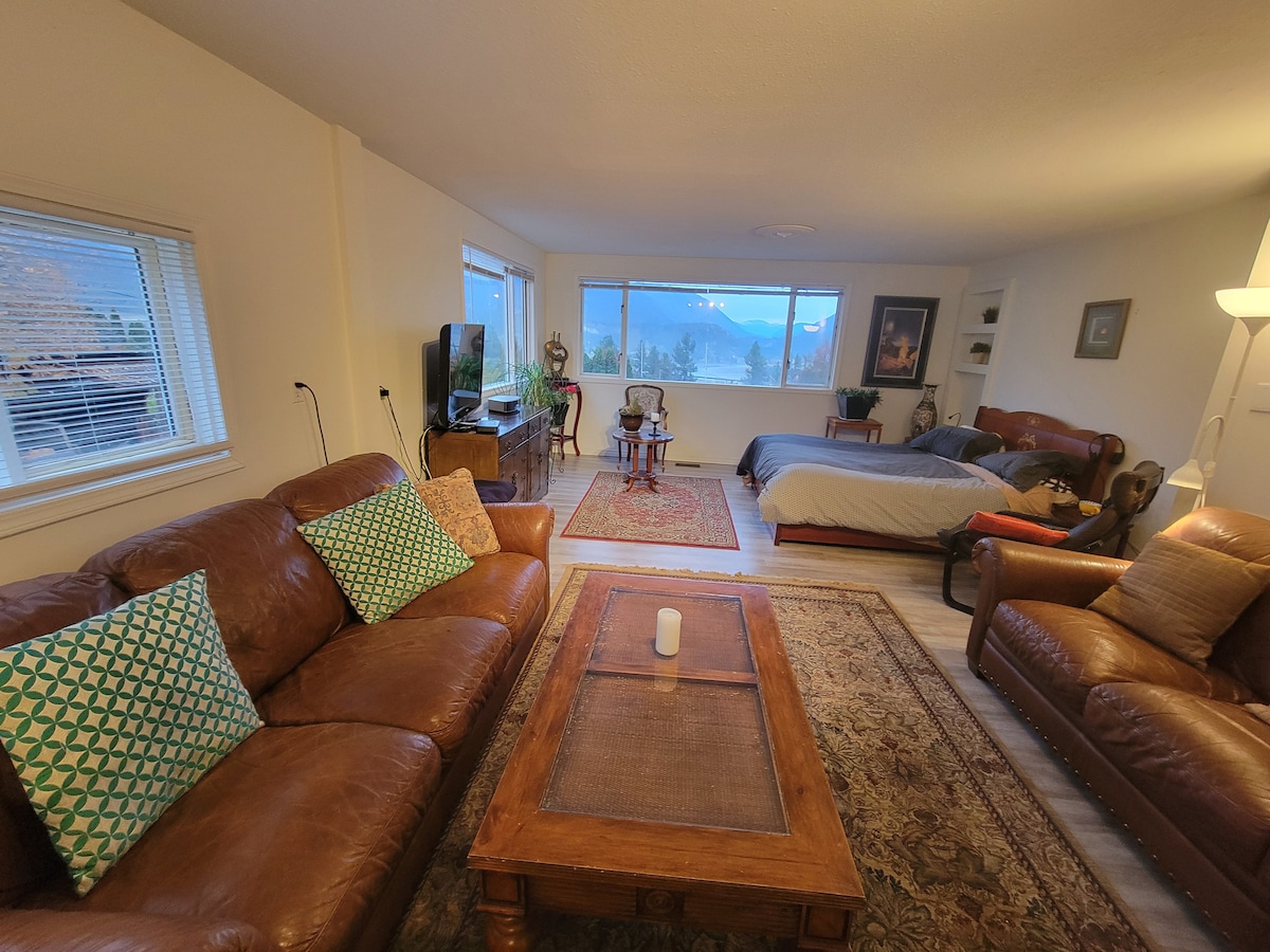 La suite del sótano, amueblada con buen gusto, de concepto abierto, cuenta con una gran sala de estar, cocina bien equipada y hasta tres camas, una cama tamaño queen y una cama de pared doble en el dormitorio, también un sofá cama tamaño queen en el L/R. Ya sea que viajes solo o traigas a la familia, esta suite es tranquila, espaciosa y está completamente equipada con todo lo que necesitas para que sea tu hogar lejos de casa. Mientras disfrutas de una hermosa vista de las montañas.