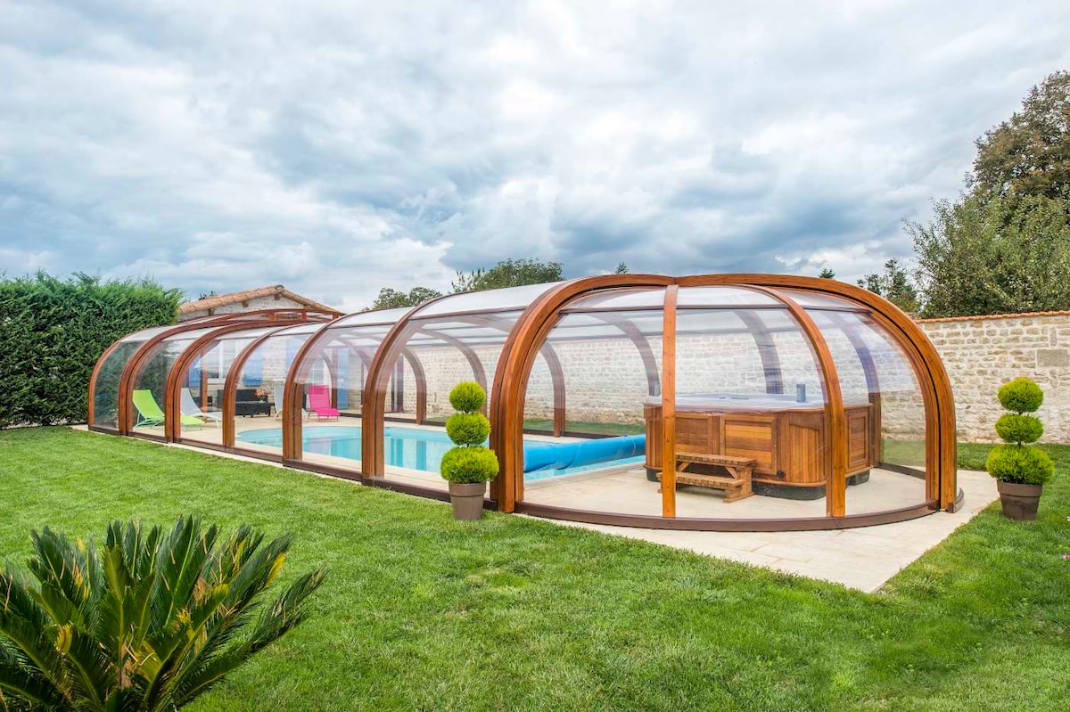 En Deux-Sèvres, en el corazón del Poitou-Charentes, entre Futuroscope y La Rochelle, descubra nuestra villa de alto standing clasificada con 5 estrellas etiquetada Gites de France para 2 a 9 personas con piscina privada (reservada exclusivamente para los veraneantes) cubierta de un refugio alto de madera telescópico climatizado a 29°C durante todo el año, spa jacuzzi bajo rotonda abatible, wifi y planta baja accesible para personas con discapacidad o movilidad reducida, etiquetado Turismo Handicap.