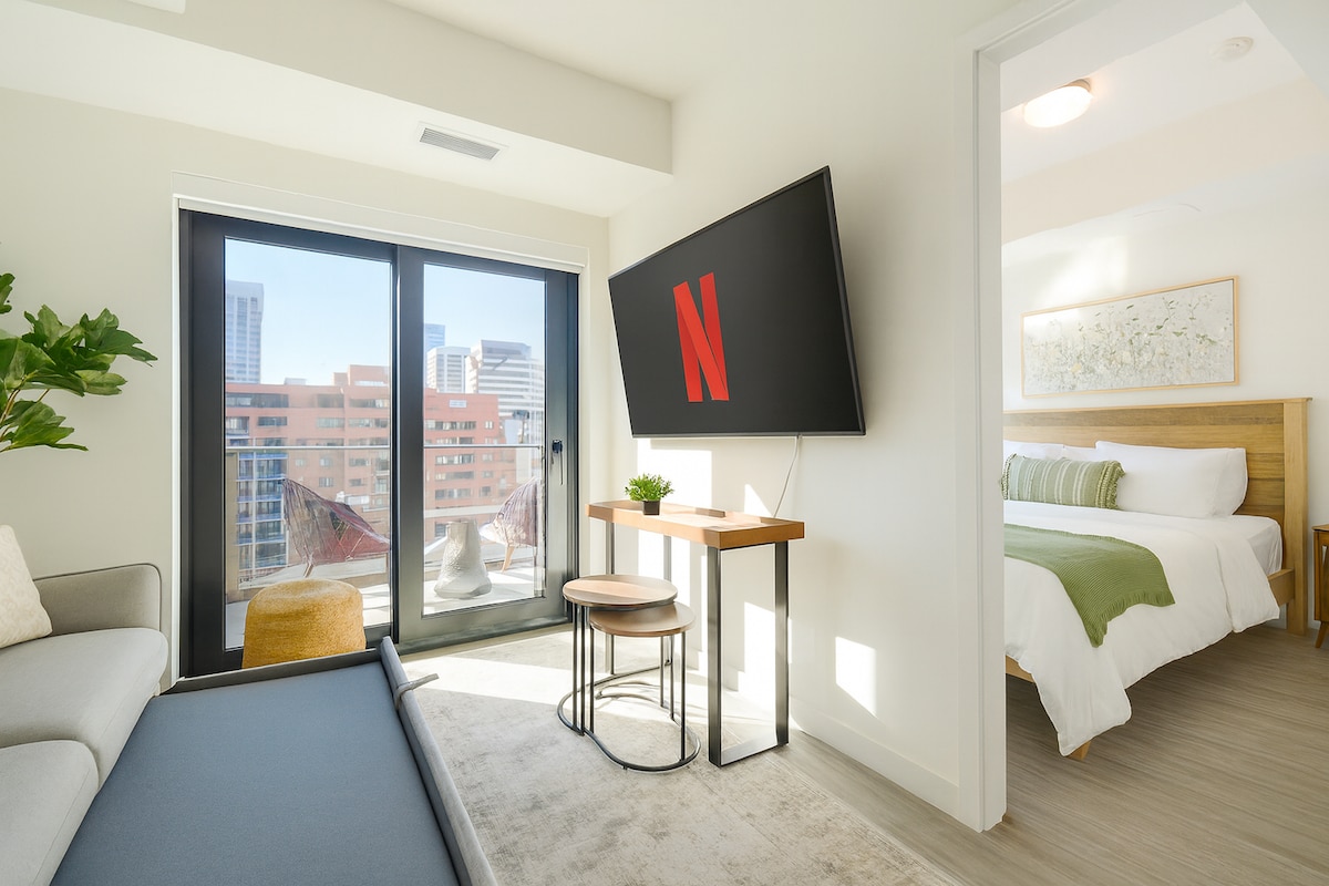Relájate y disfruta del horizonte de Calgary desde este elegante y cómodo condominio de 1 dormitorio + gran estudio, perfectamente ubicado en el corazón del centro de la ciudad. Con espacio para un máximo de 5 huéspedes, es ideal para parejas, viajeros solitarios, estancias de negocios o una escapada de fin de semana con amigos. Estarás a pocos pasos de Prince 's Island Park, los senderos del río Bow, Eau Claire y el centro comercial CORE, todo en uno de los vecindarios más transitables y amigables para bicicletas de Calgary.